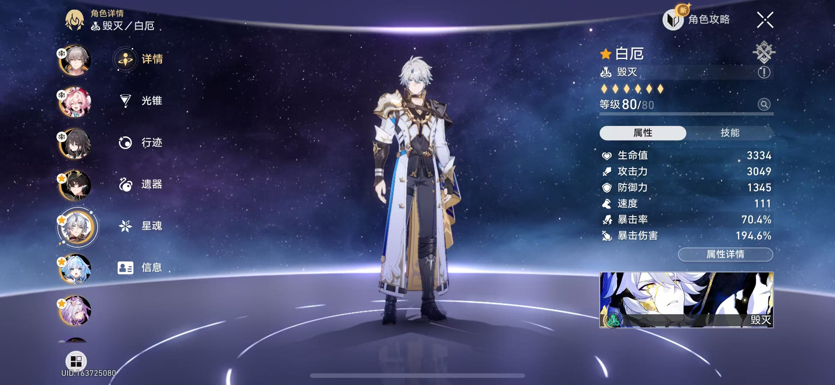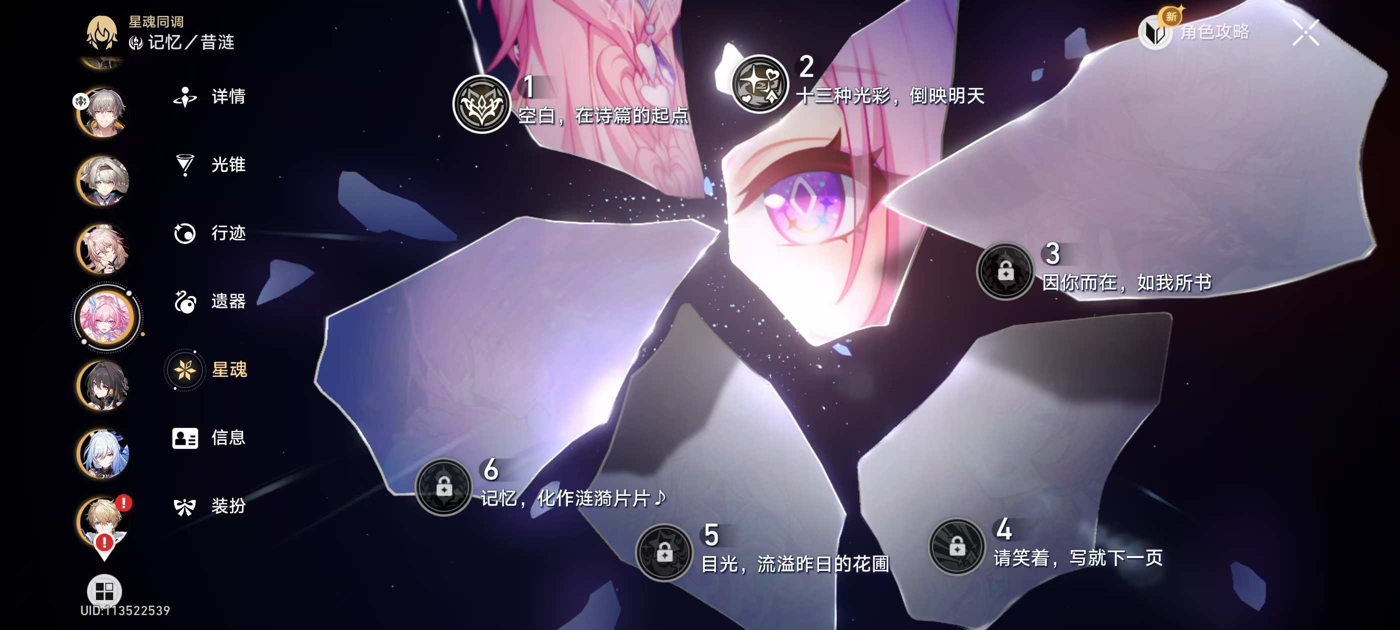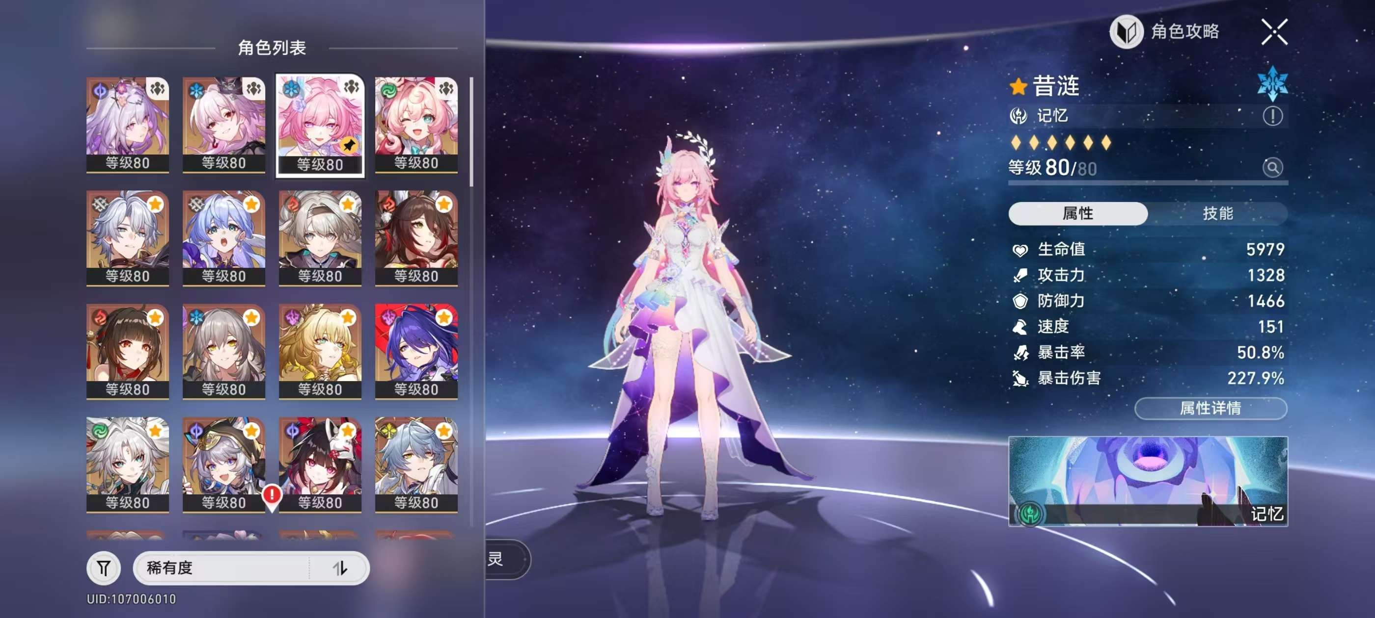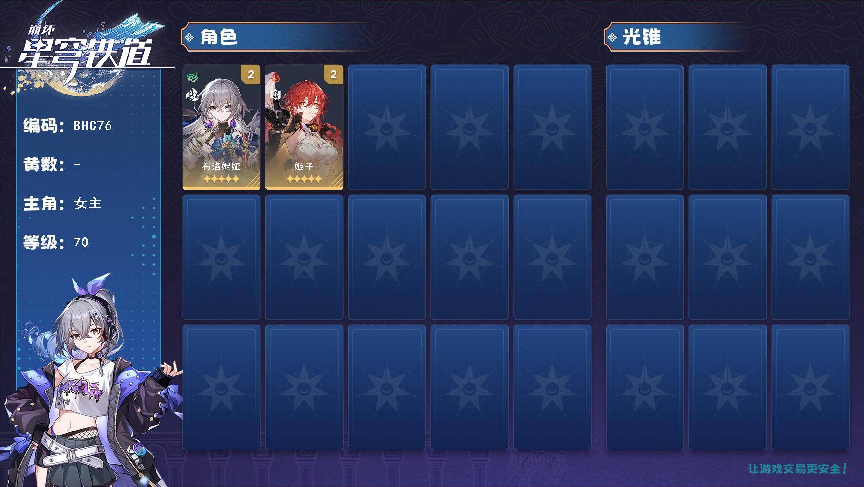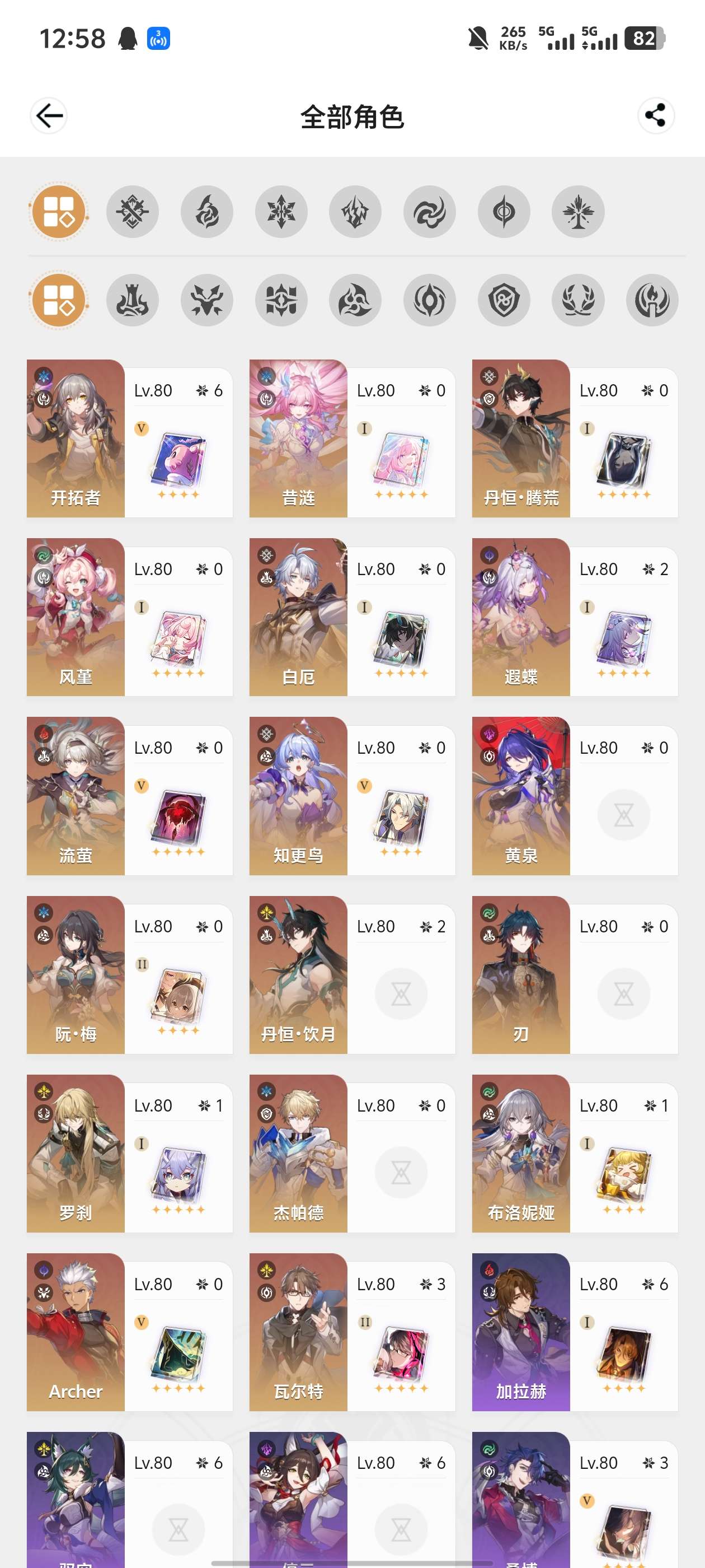 等级:70/女主/Archer/Saber/知更鸟/姬子/瓦尔特/布洛妮娅/杰帕德/克拉拉/彦卿/白露/丹恒•腾荒/长夜月/黄泉/黑天鹅/飞霄/遐蝶/真理医生/阿格莱雅/藿藿/阮·梅/星期日/托帕&账账/2命姬子