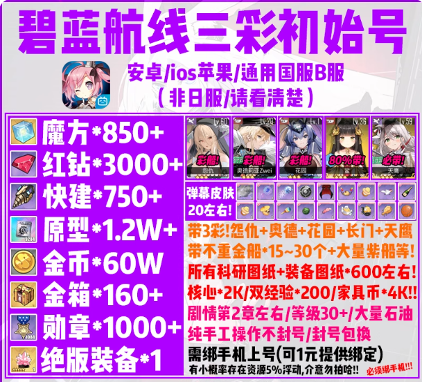 碧蓝航线初始号自抽号安卓b服官服苹果钻石金船魔方红钻彩船怨仇
