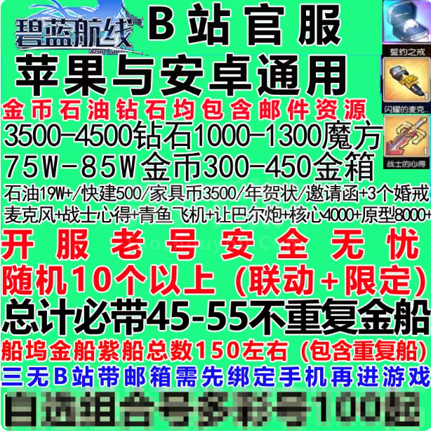 钻石7500+魔方1000-1500个+光辉+企业+胡德+厌战+圣地亚哥总计40-70不重复金船