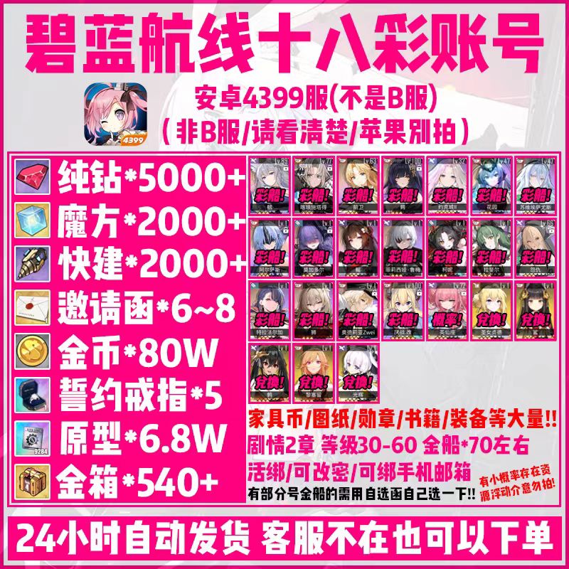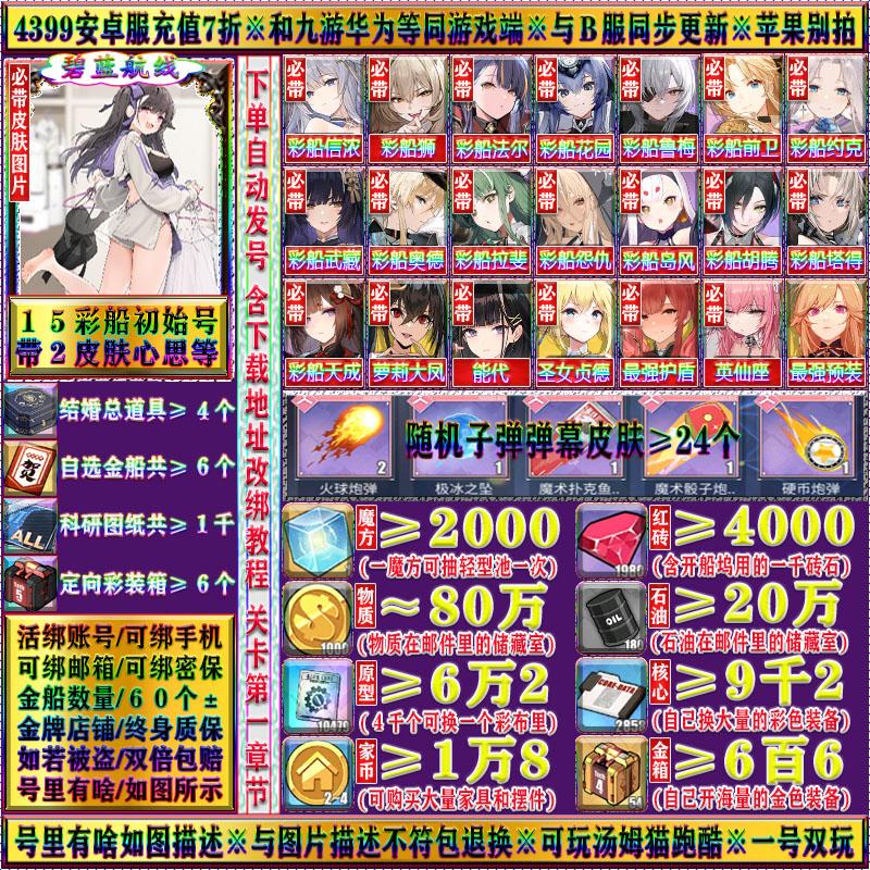 碧蓝航线【全服通用】4399服随机区(主图描述):带23个彩船等大量金船+大量资源