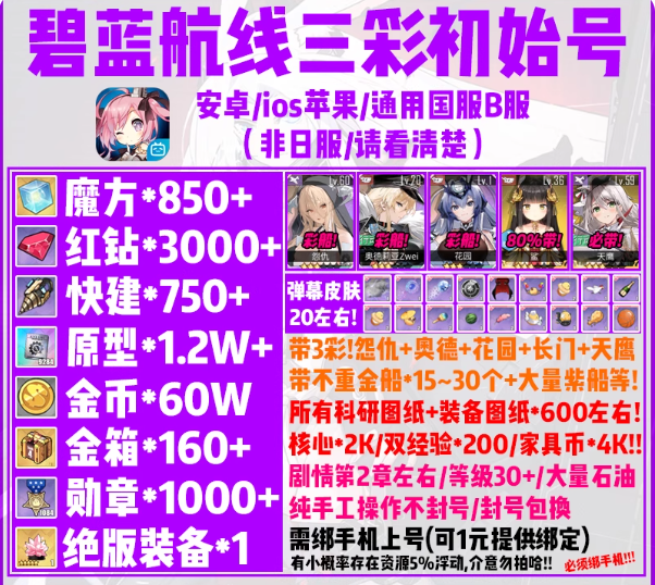 碧蓝航线【安卓B服】需绑手机-3000钻850魔方+3彩(怨奥花)+天鹰+长门+15金船