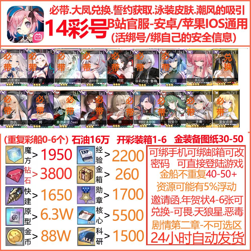 碧蓝航线【安卓B服】【必带UR怨仇+UR猃+10-50个金船】魔方500-1500,钻石5000-6000,快建400+