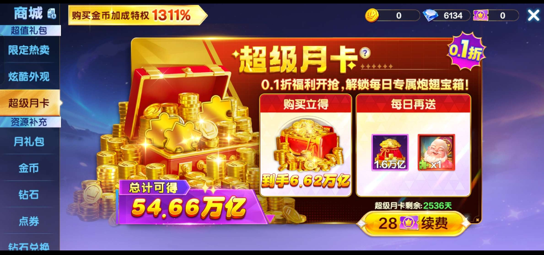 V11差一点经验升级V12,258万亿,限时30亿炮,带永久天神副炮,还有一个充值鎏金之神,性价比高