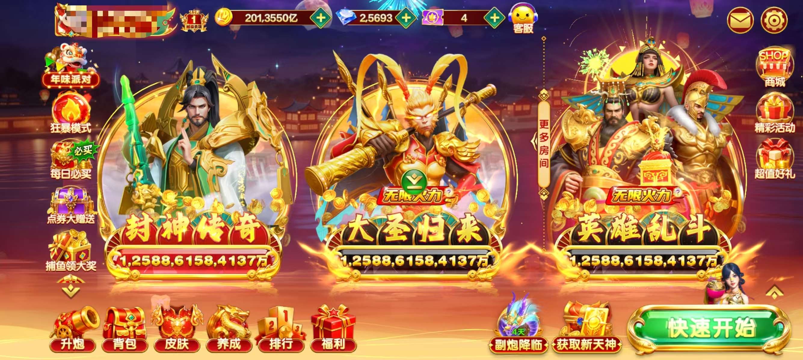 捕鱼大咖文字号v10有永久天神 实际加成1千 月卡已开通 炮台10亿 爆发高