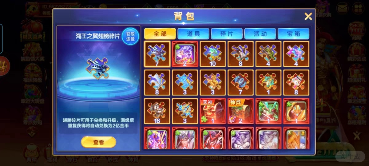 捕鱼大咖小米版,V8,6.5亿炮,带天神碎片,1205级。带永久天神-秦始皇,嫦娥,3级白骨精