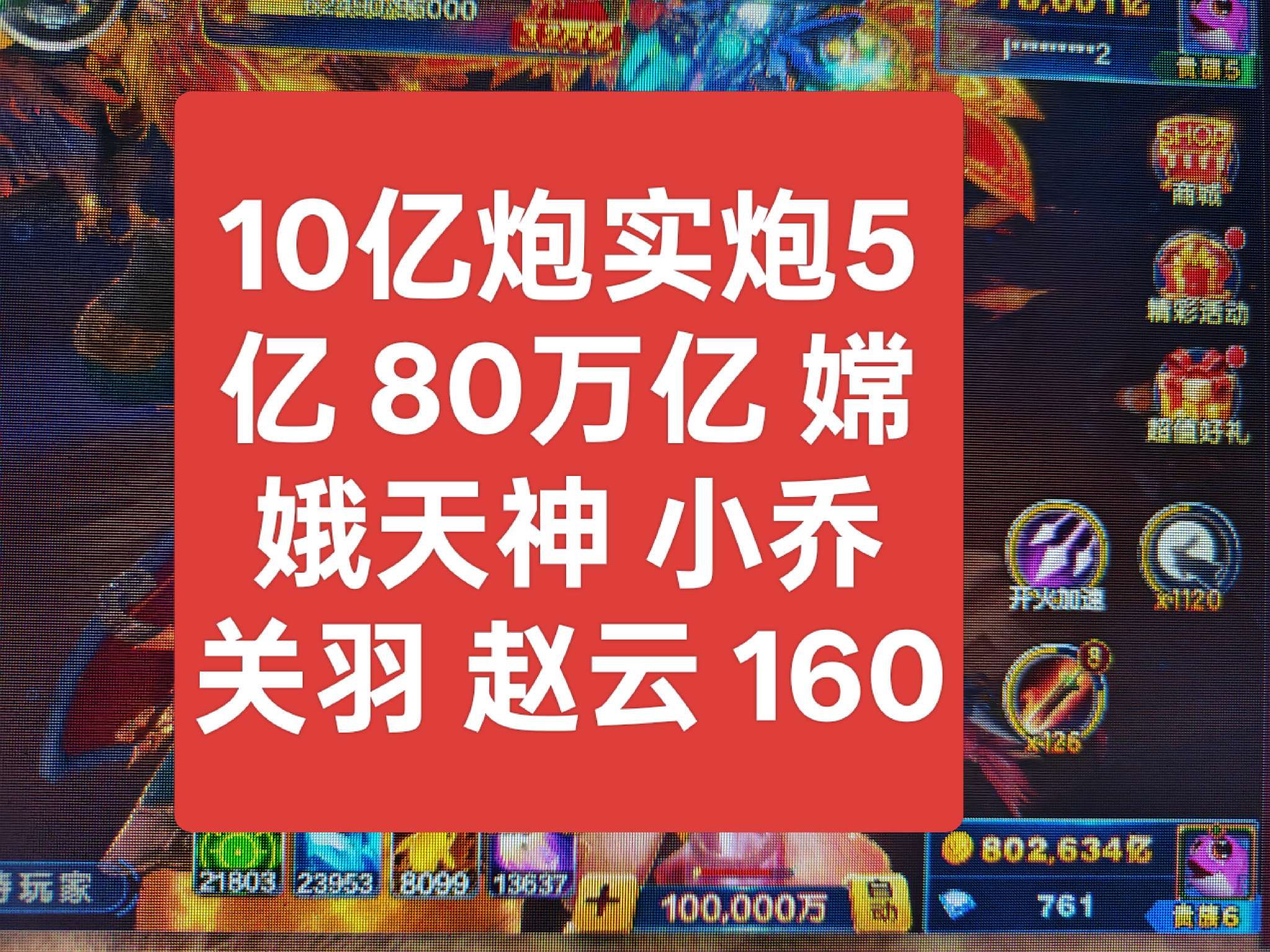 捕鱼大咖小米版10亿炮实炮5 嫦娥天神 小乔诸葛关羽貂蝉吕布赵云
