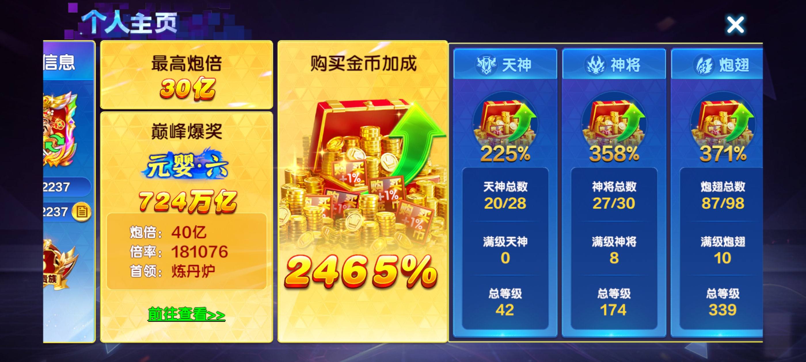 捕鱼大咖S5-加成2465-全神将多满级,多天神42级救济4万亿 神器全满级