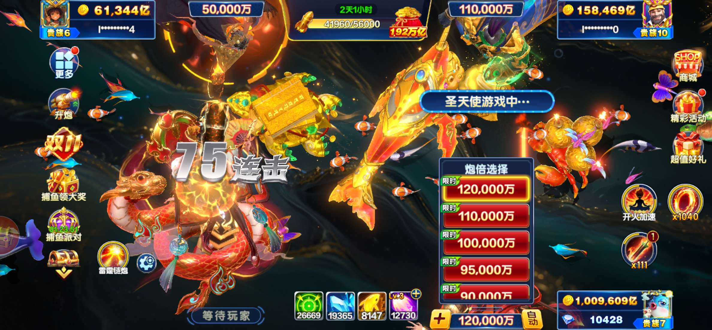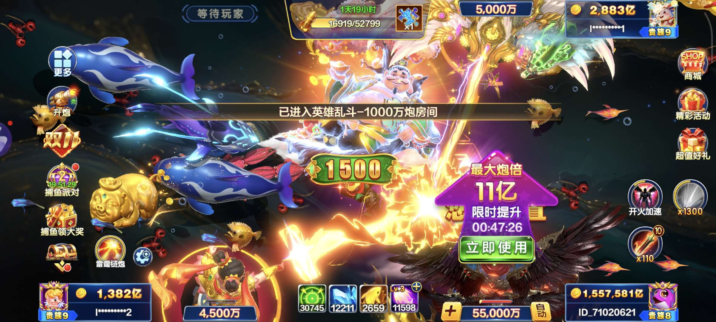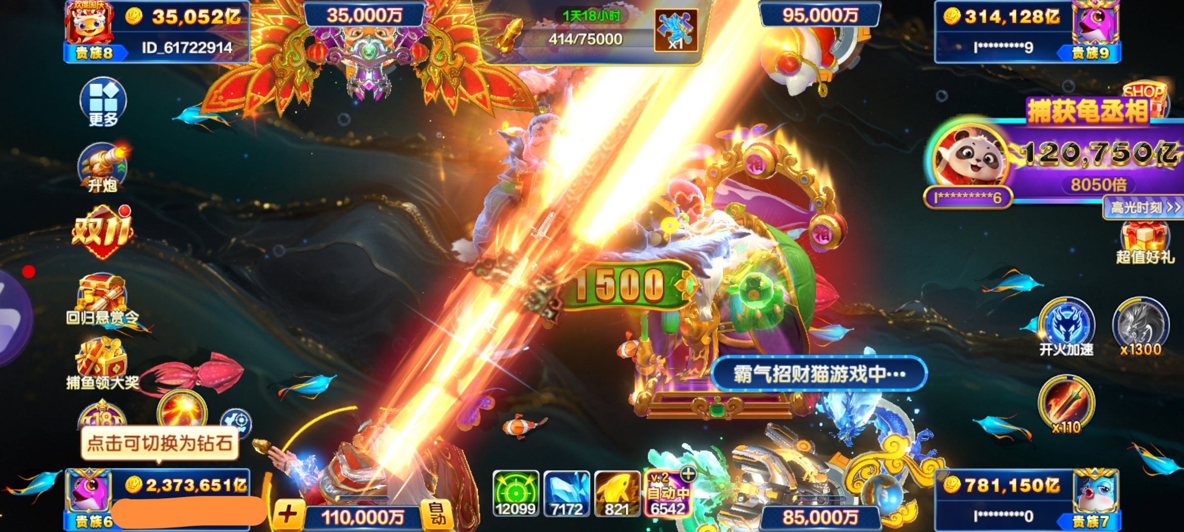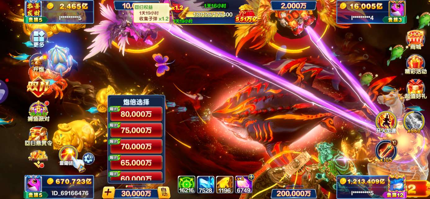 捕鱼大咖【安卓官方】官方ID s5 加成2156 30亿炮倍 双副炮