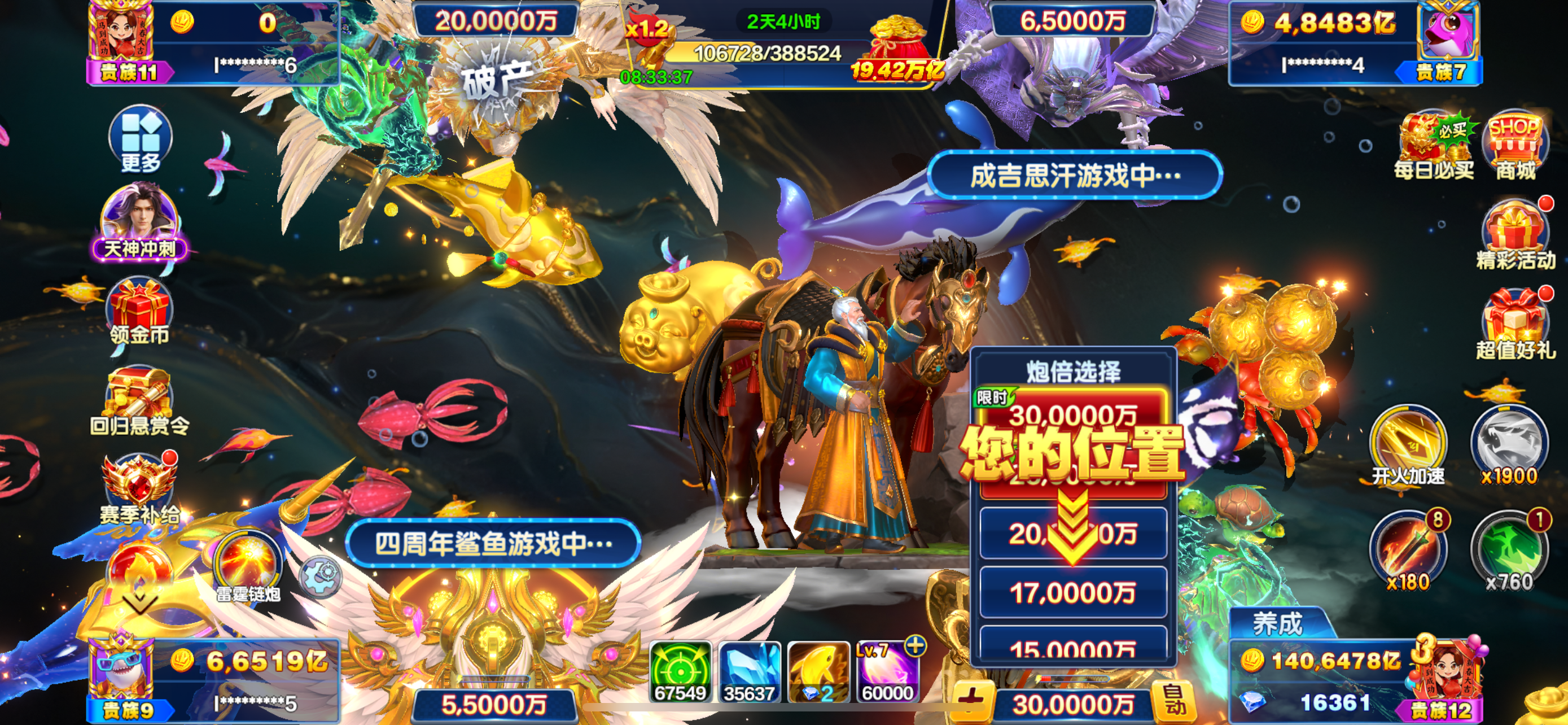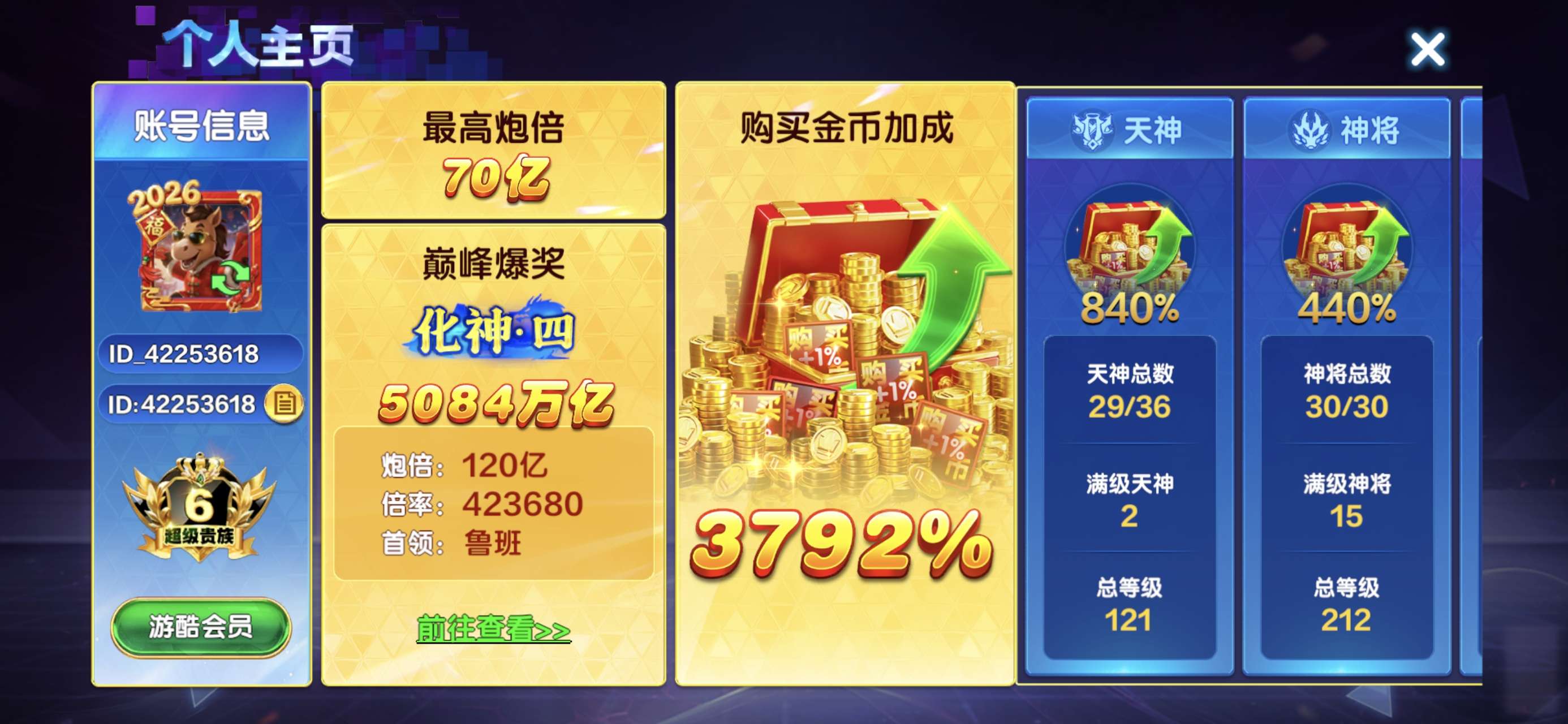 官方账号,超级s6,70亿炮,3800金币加成,天神,满神将,副炮,小助理