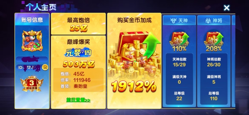 捕鱼大咖极品ID号 至尊5 神将神兵都满了 实际加成7038