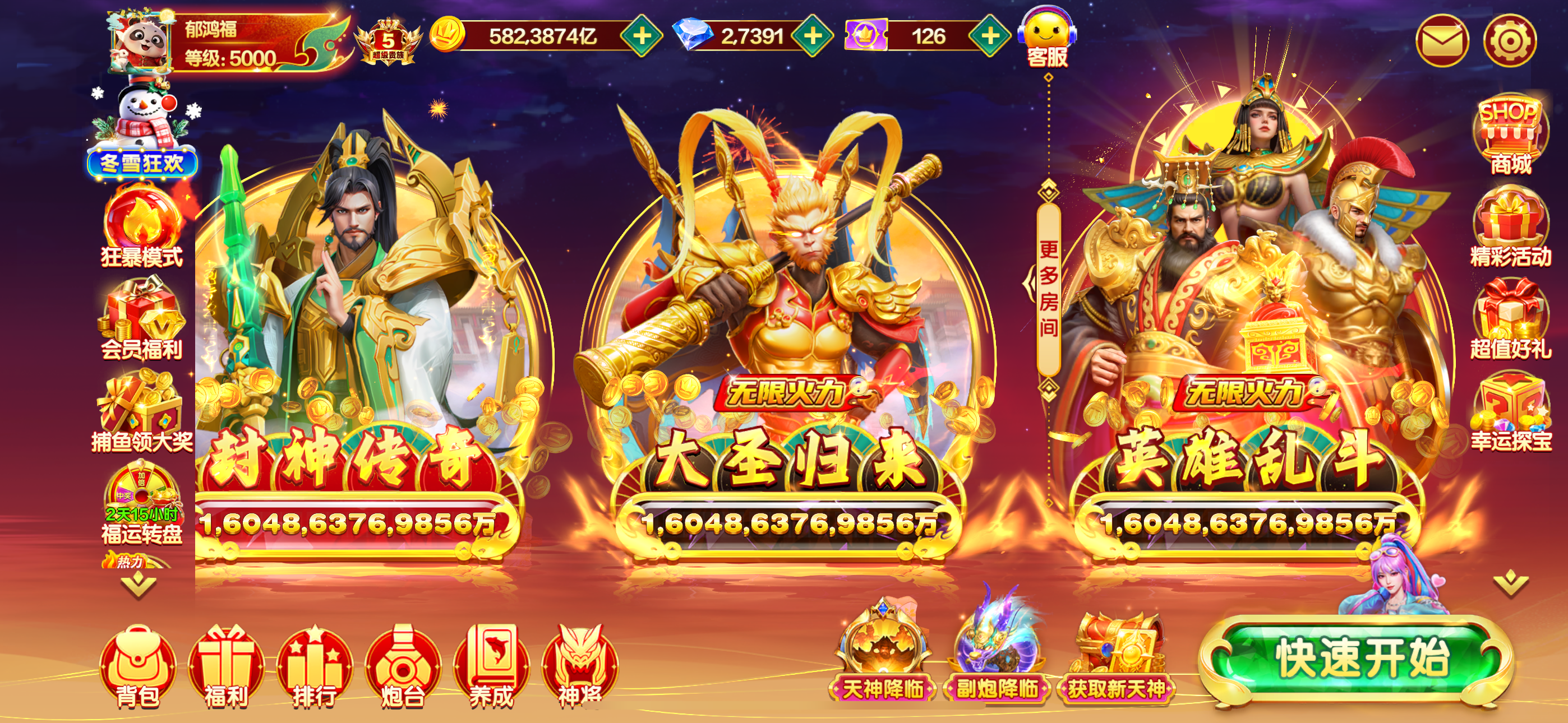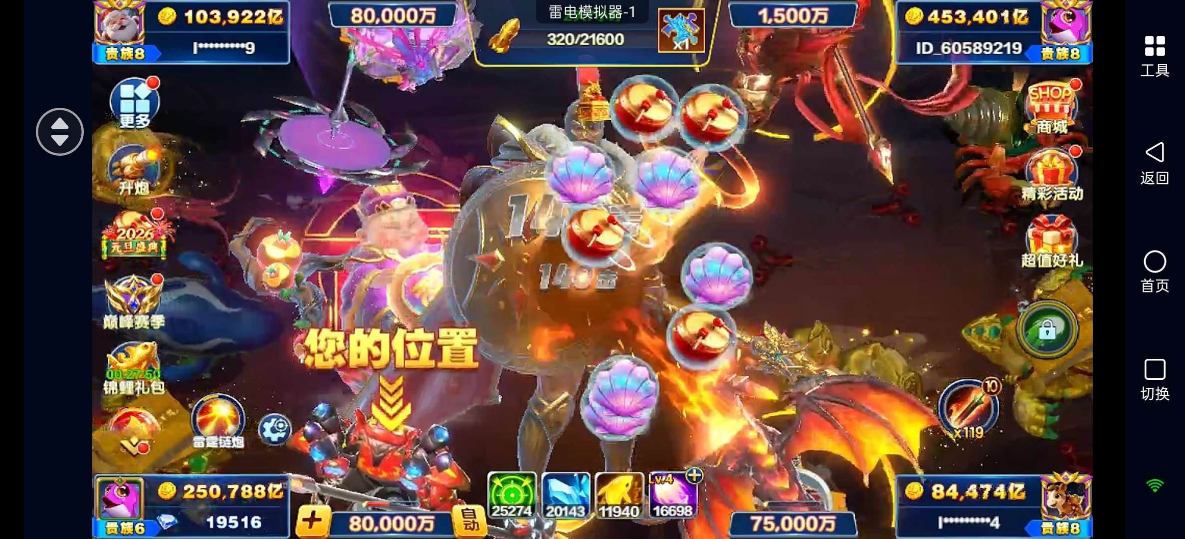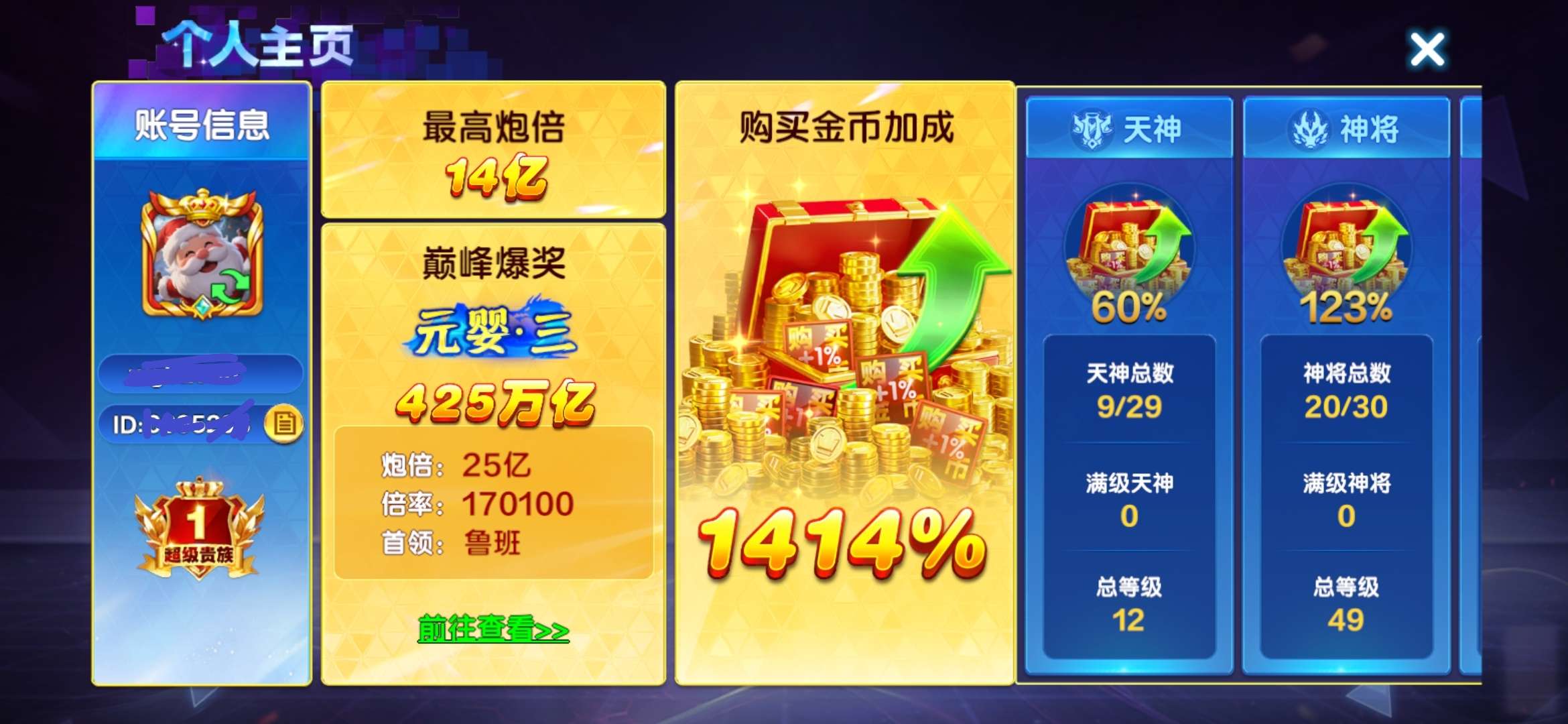 捕鱼大咖500万亿纯玩贵族9-~10个神将永久副炮实炮8亿炮虚40亿炮