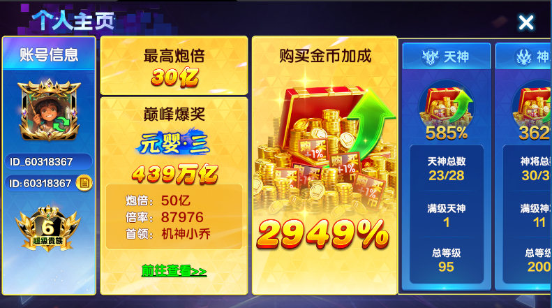 捕鱼大咖官方纯玩0.01比例 任何分段10万亿-99999万亿统一价格 起步10亿炮5级光天神副炮