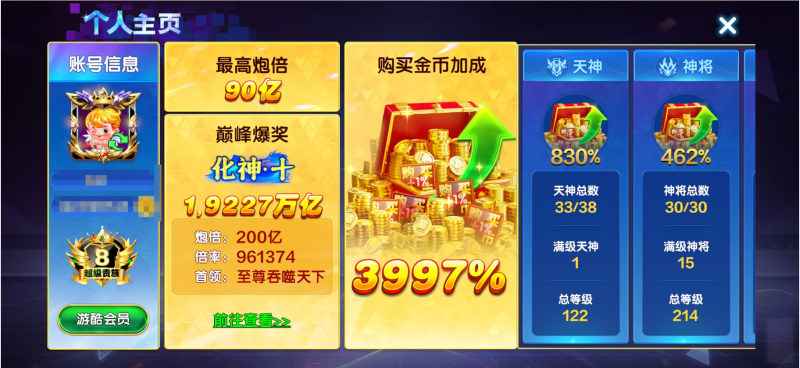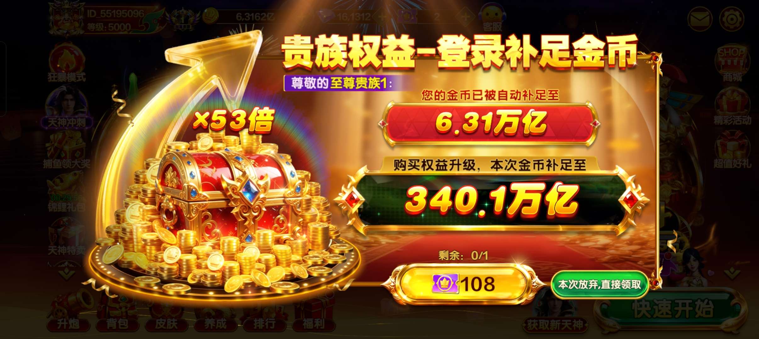 至尊贵族一便宜甩人物只缺一个,金币加成5304%,炮倍120亿 再加上累充200多万