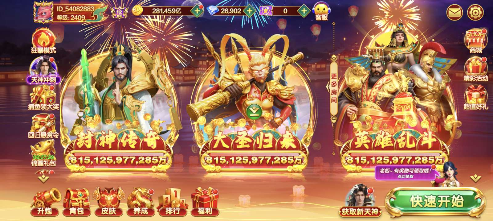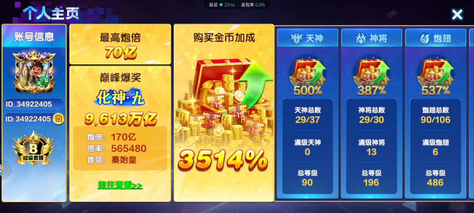 捕鱼大咖联想版 实炮12亿炮 限时30亿炮 可升炮 永久多天神 永久副炮!!1300万亿