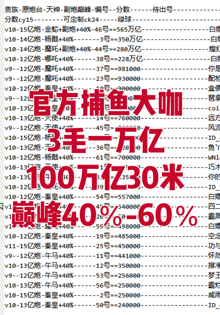 捕鱼大咖ID号,超级贵族7,天神,神将多种炮台,最大炮台4.5亿,卖断