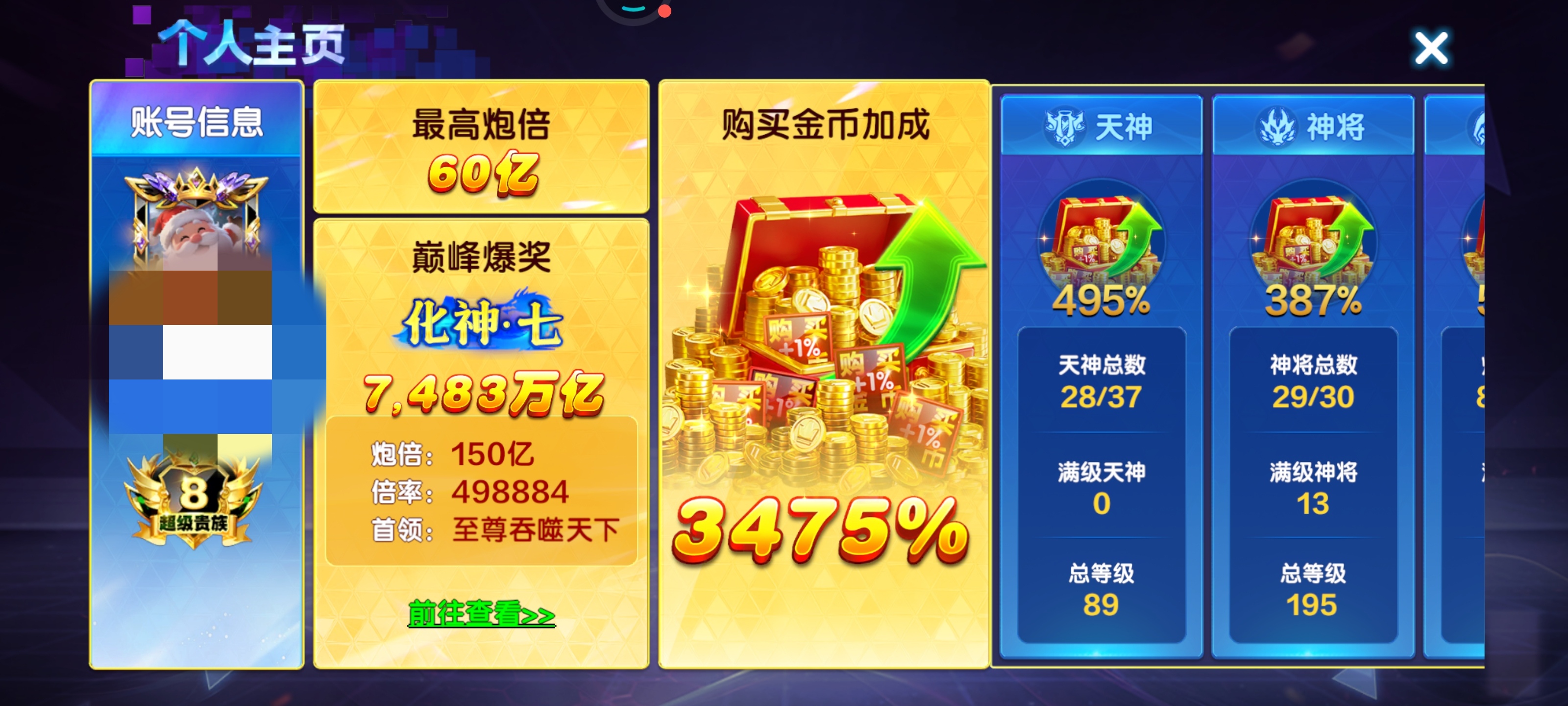超级贵族2 天神总等级42 神将总等级110 副炮3个 小助理总等级9 30亿炮 急用钱出号QQ登陆