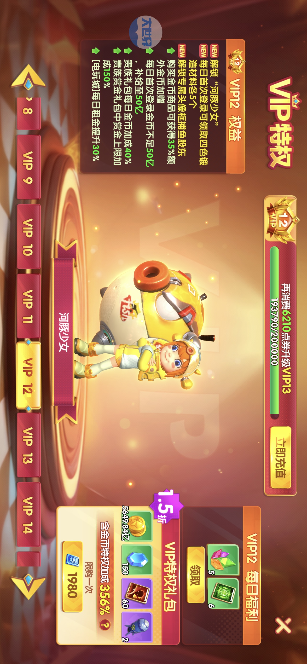 捕鱼大世界vip6,24万亿,第二天,赛季+点卷周卡已开,8个神话自选宝箱,350点卷,1.5倍率