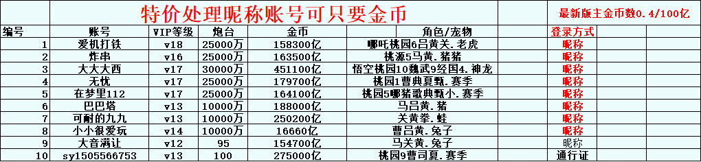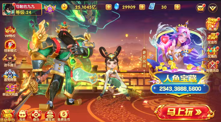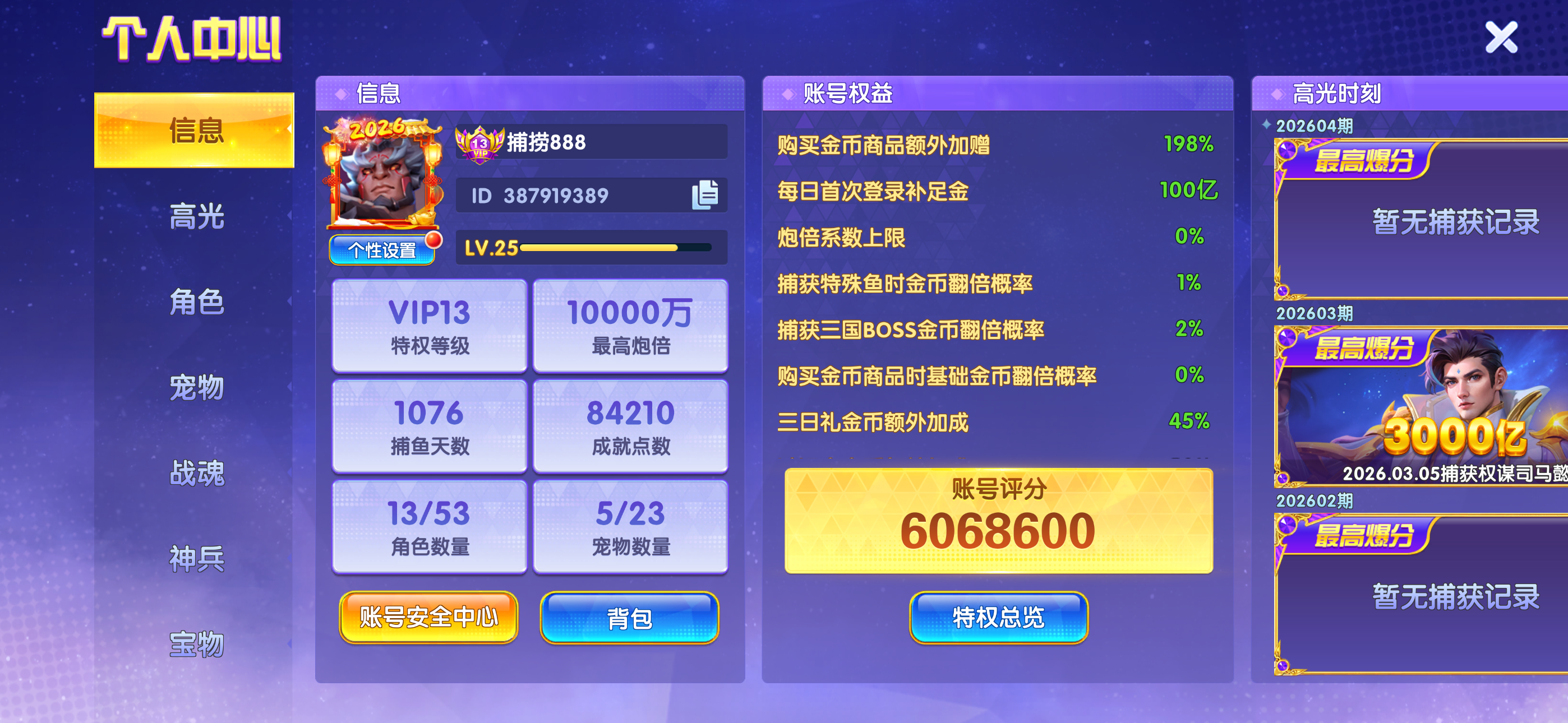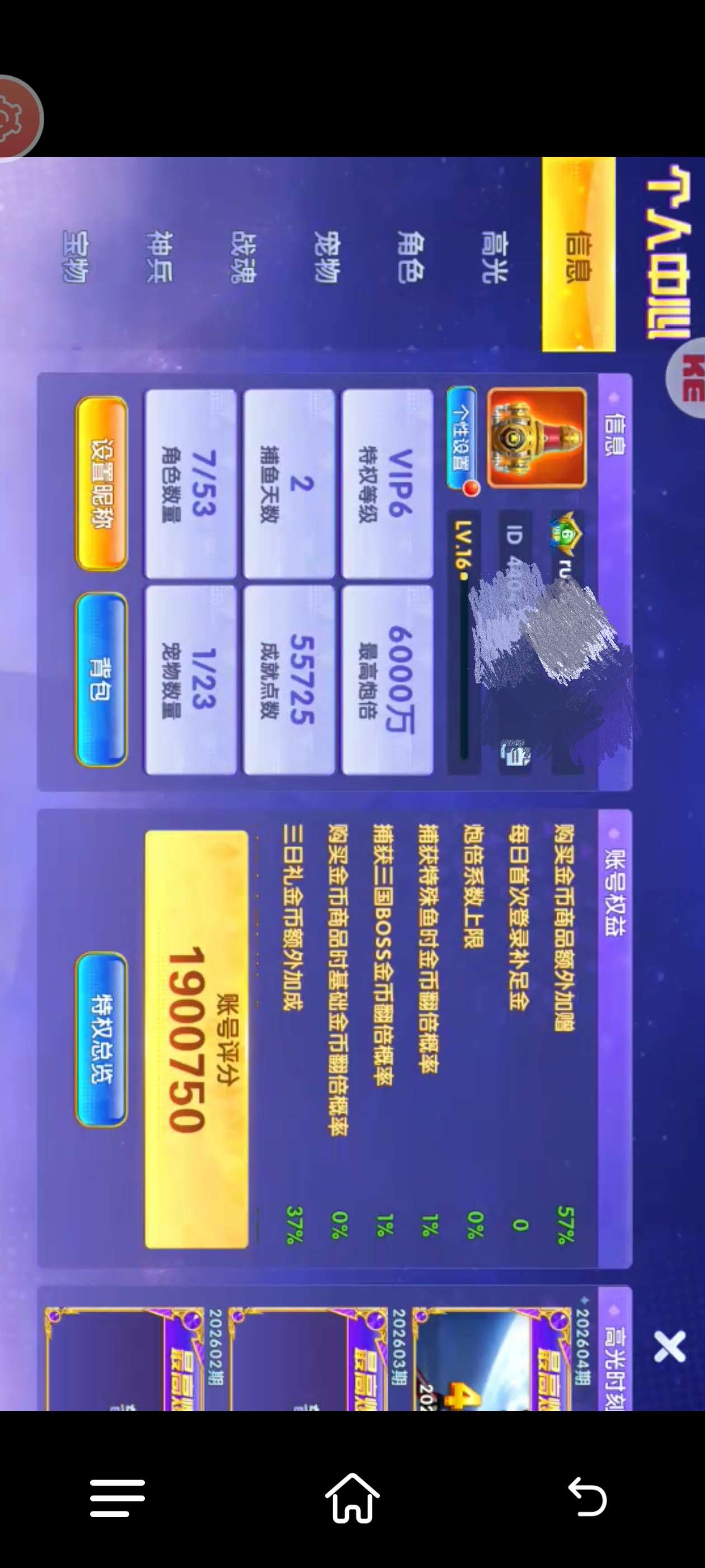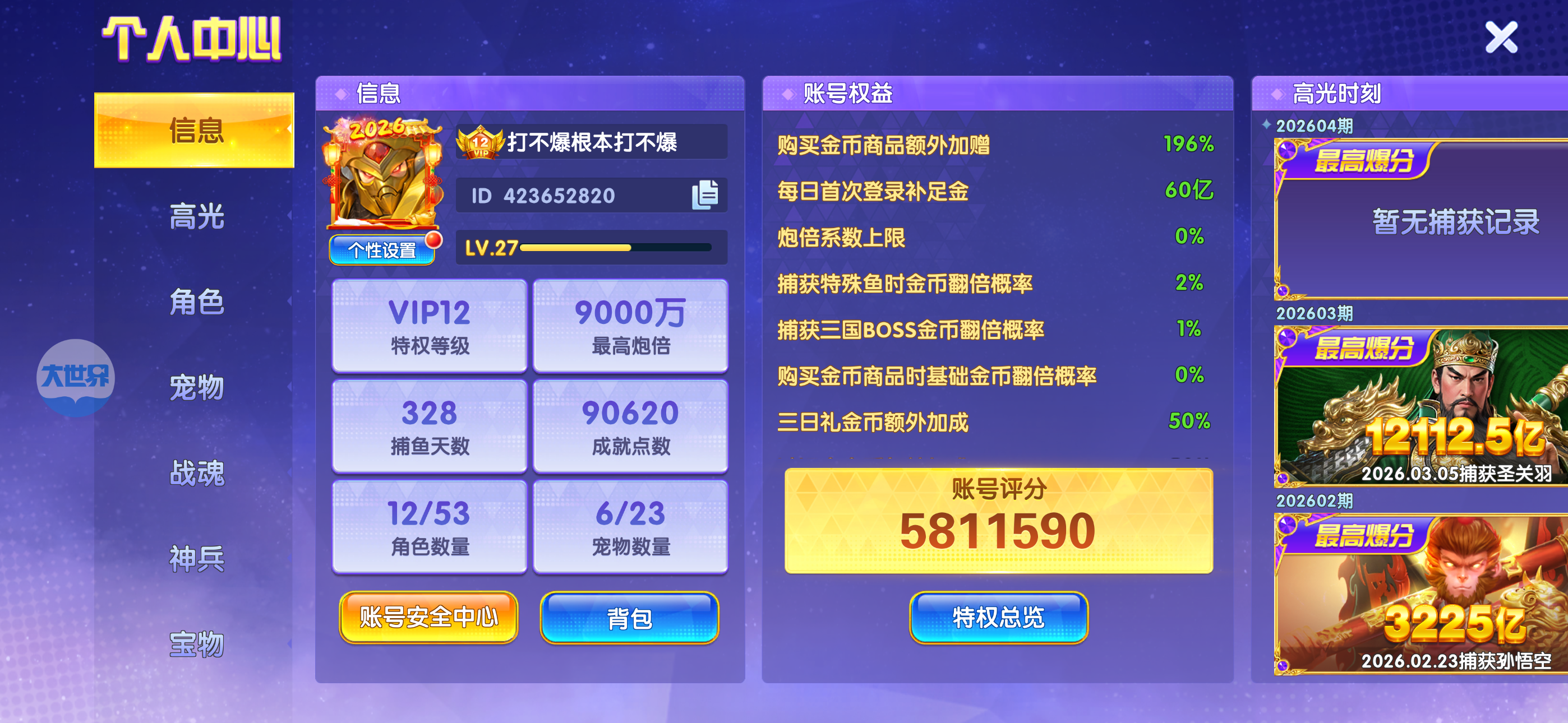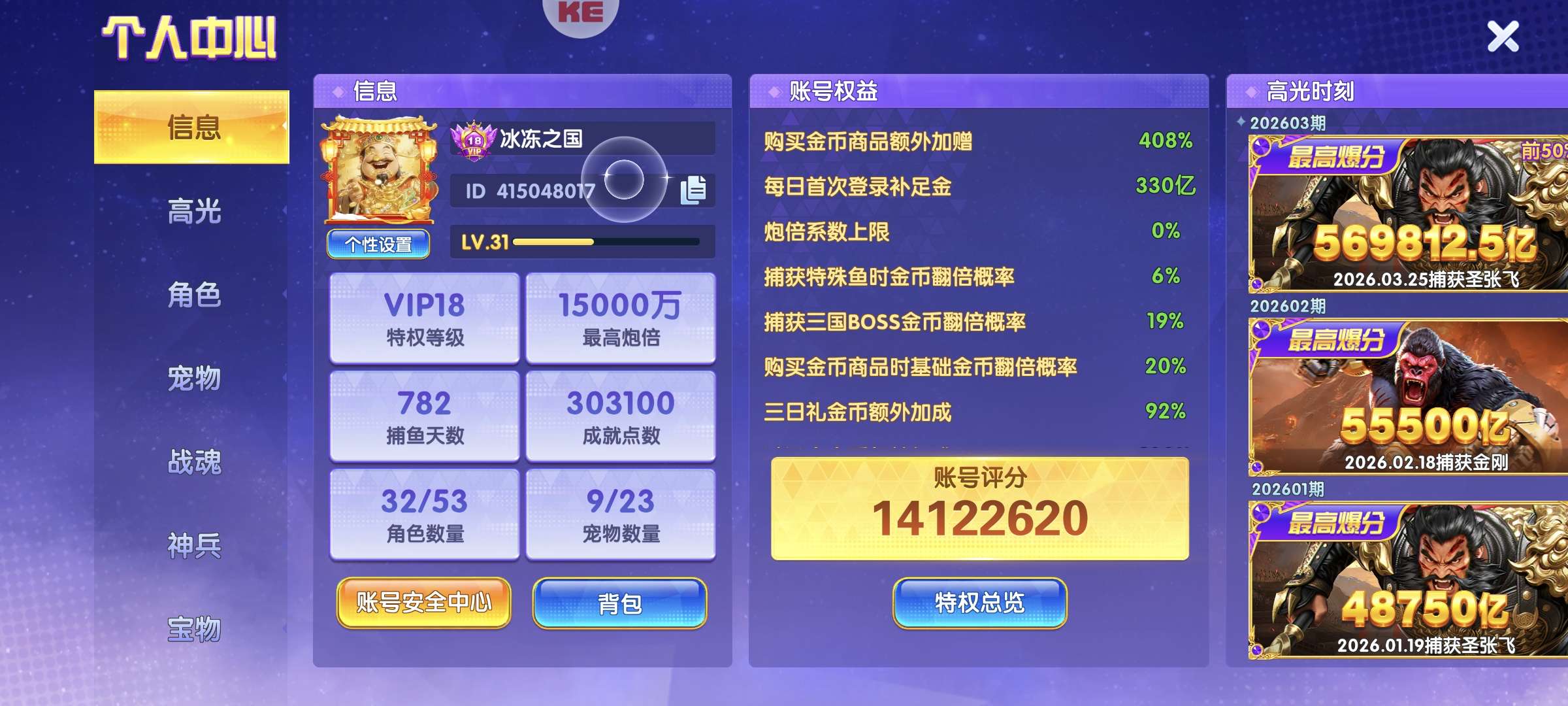 昵称登陆VIP13关羽黄忠拳手.赛季宠物 100W炮台 250800亿金币 倍率突破2