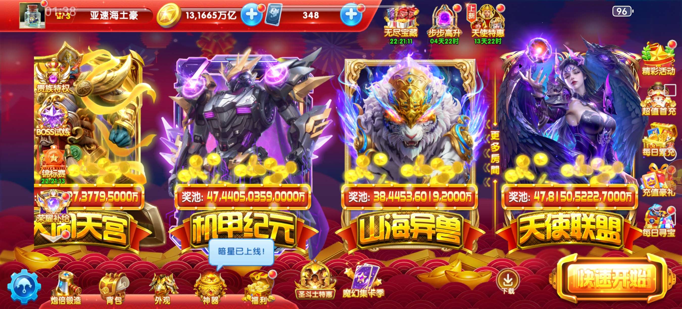 拥有最新战神切西亚,翅膀差五个全满,炮台基本满,西游神器满九,机甲神器满九,天使惩