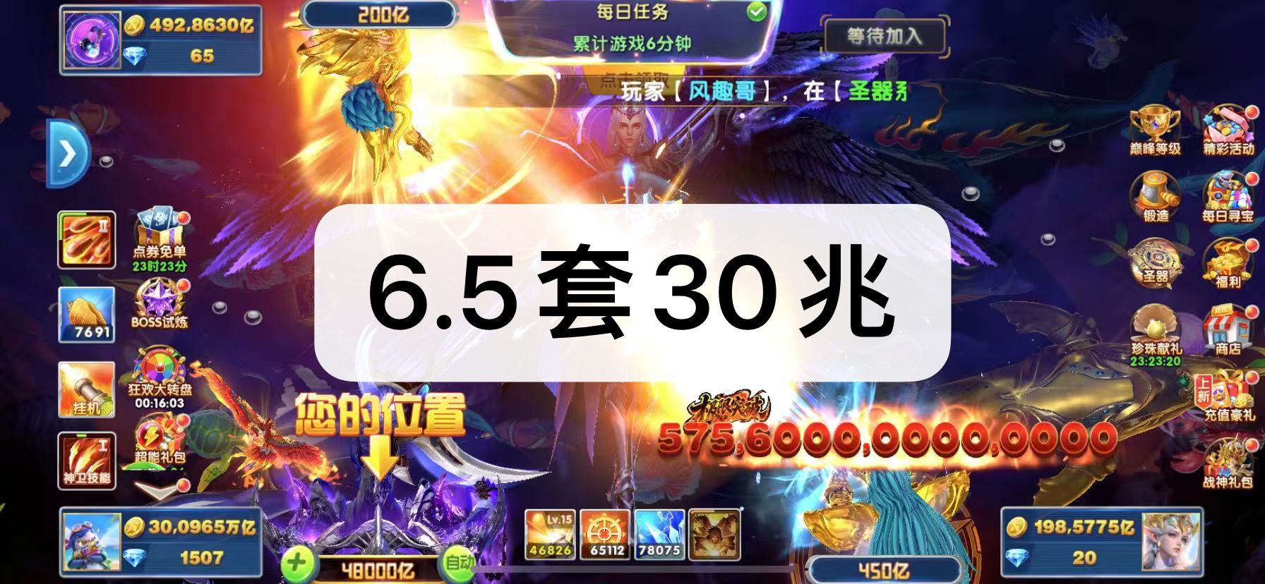 捕鱼大作战v3,51600万亿虚炮90,黄金吕布带超能巅峰15。八开可以改密保