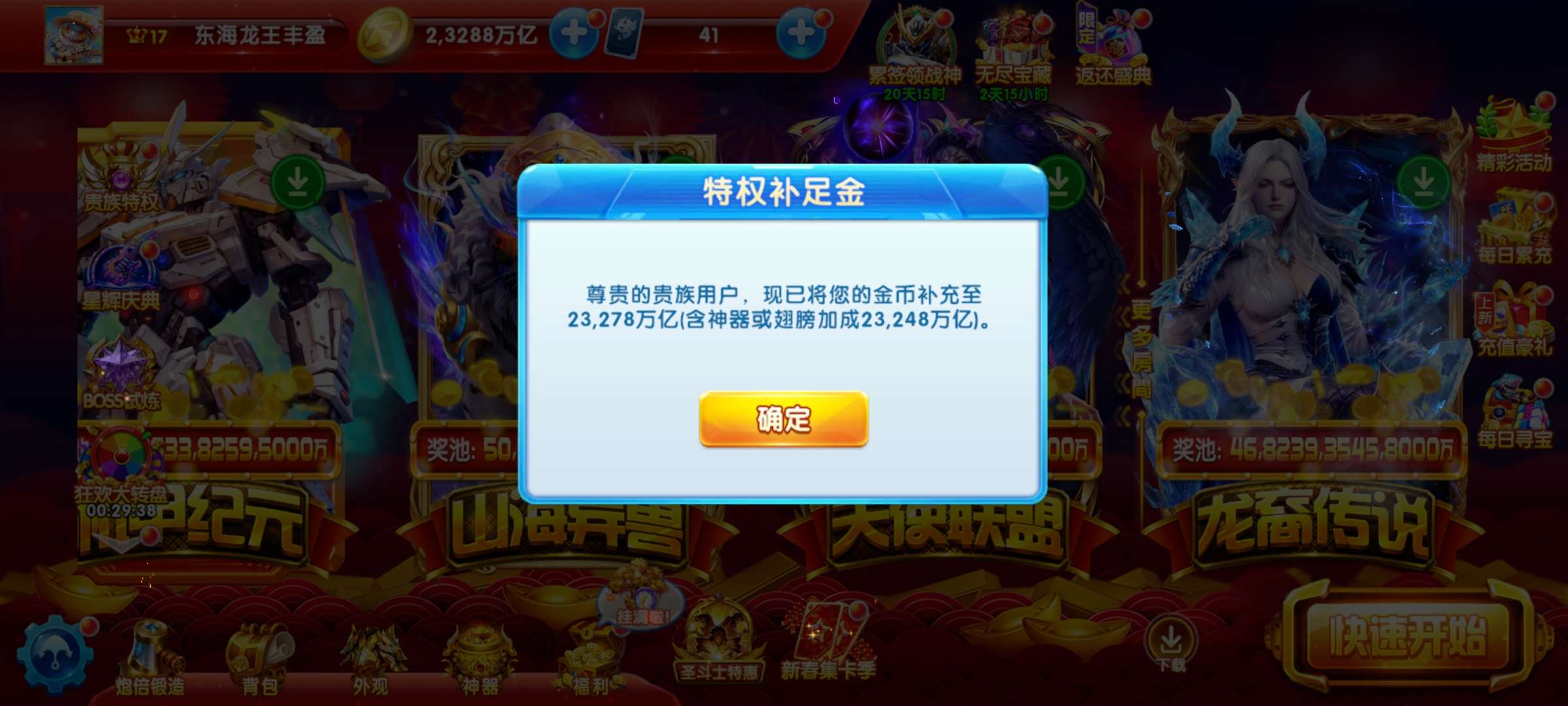 2兆救济金vivo贵族16,17%翻倍概率满炮满巅峰购金加成1406%双神卫雅典娜天使惩戒 技能齐全