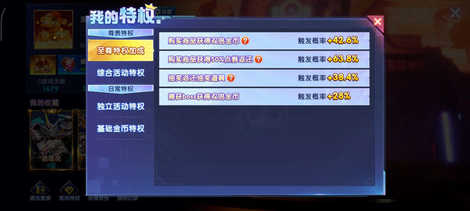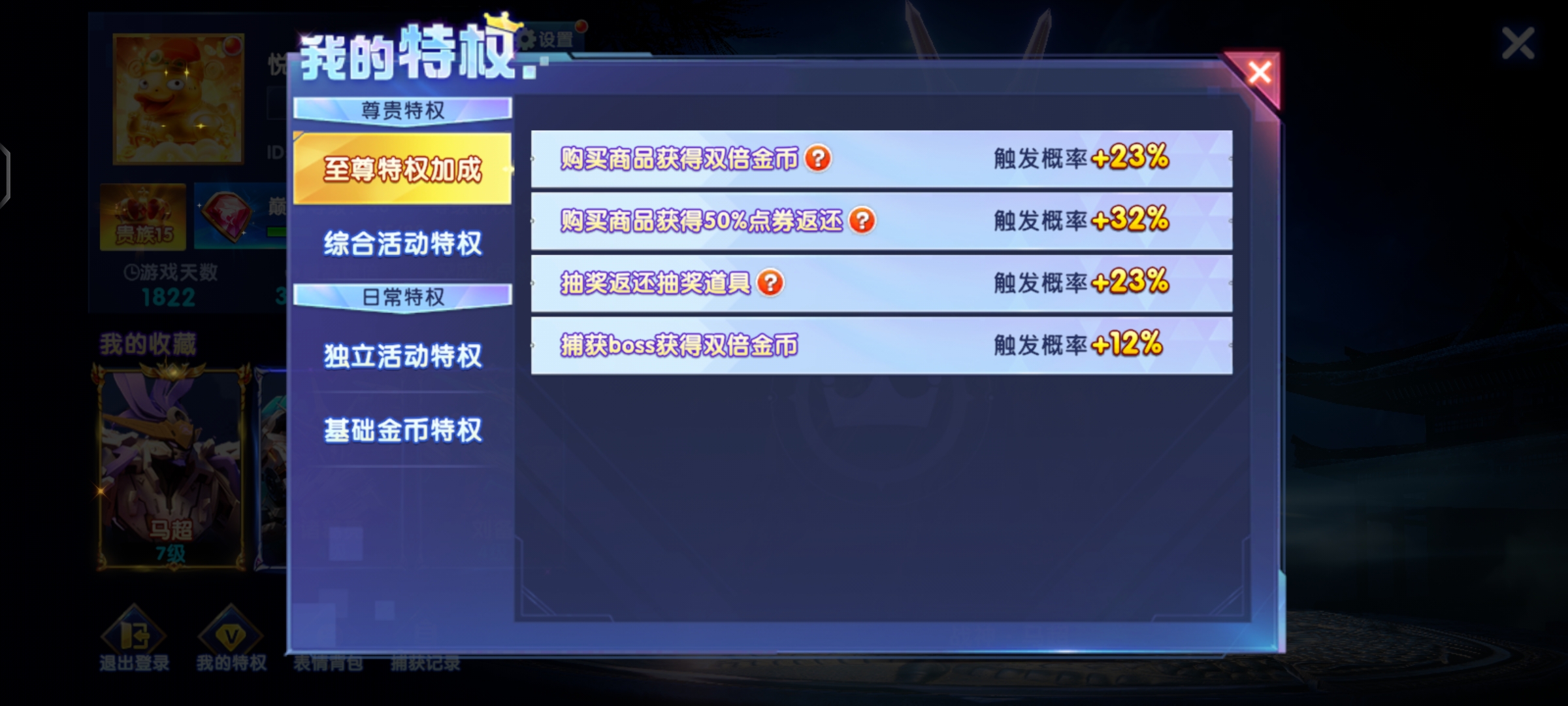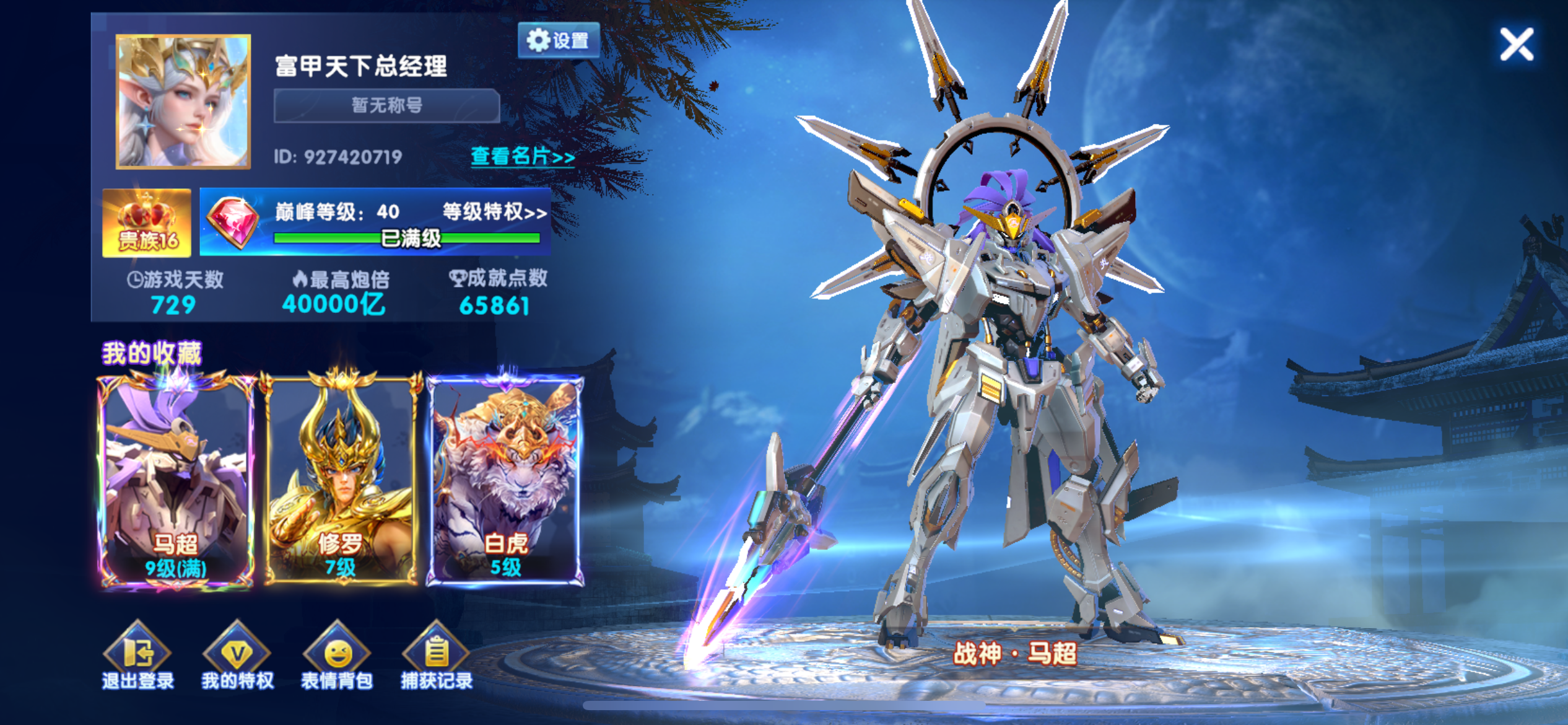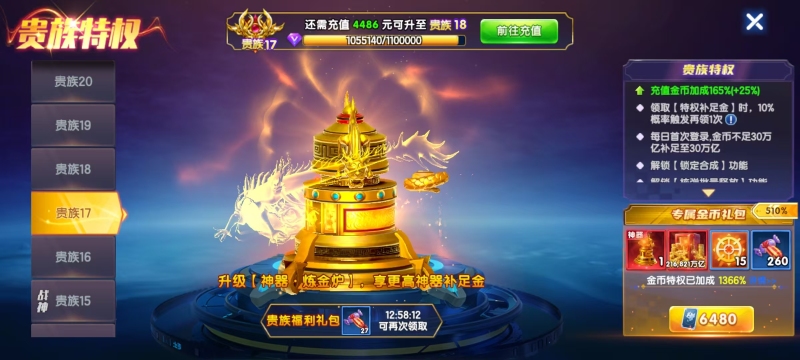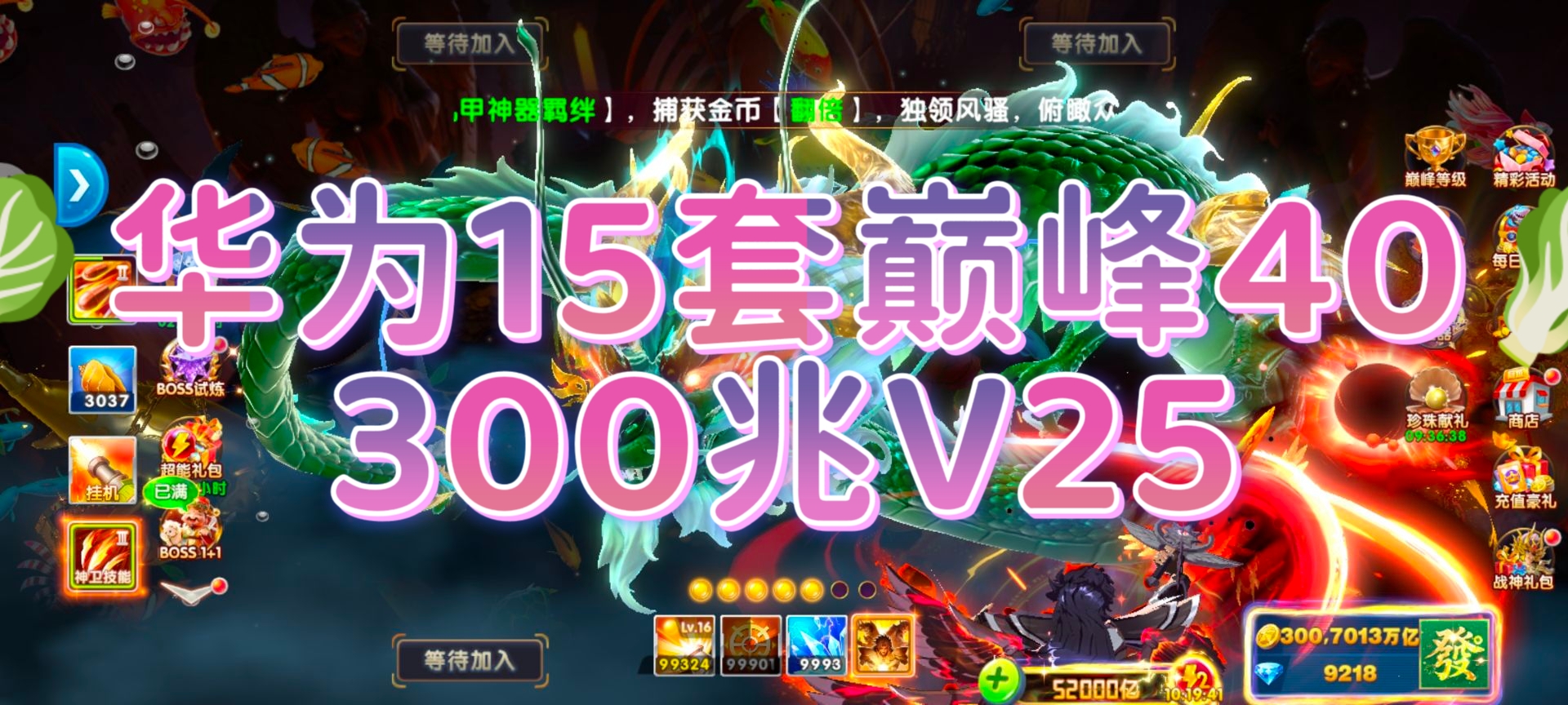 华为贵族25号,14级套,金币加成1600,圣器满级,特权12已过半。满炮满巅峰