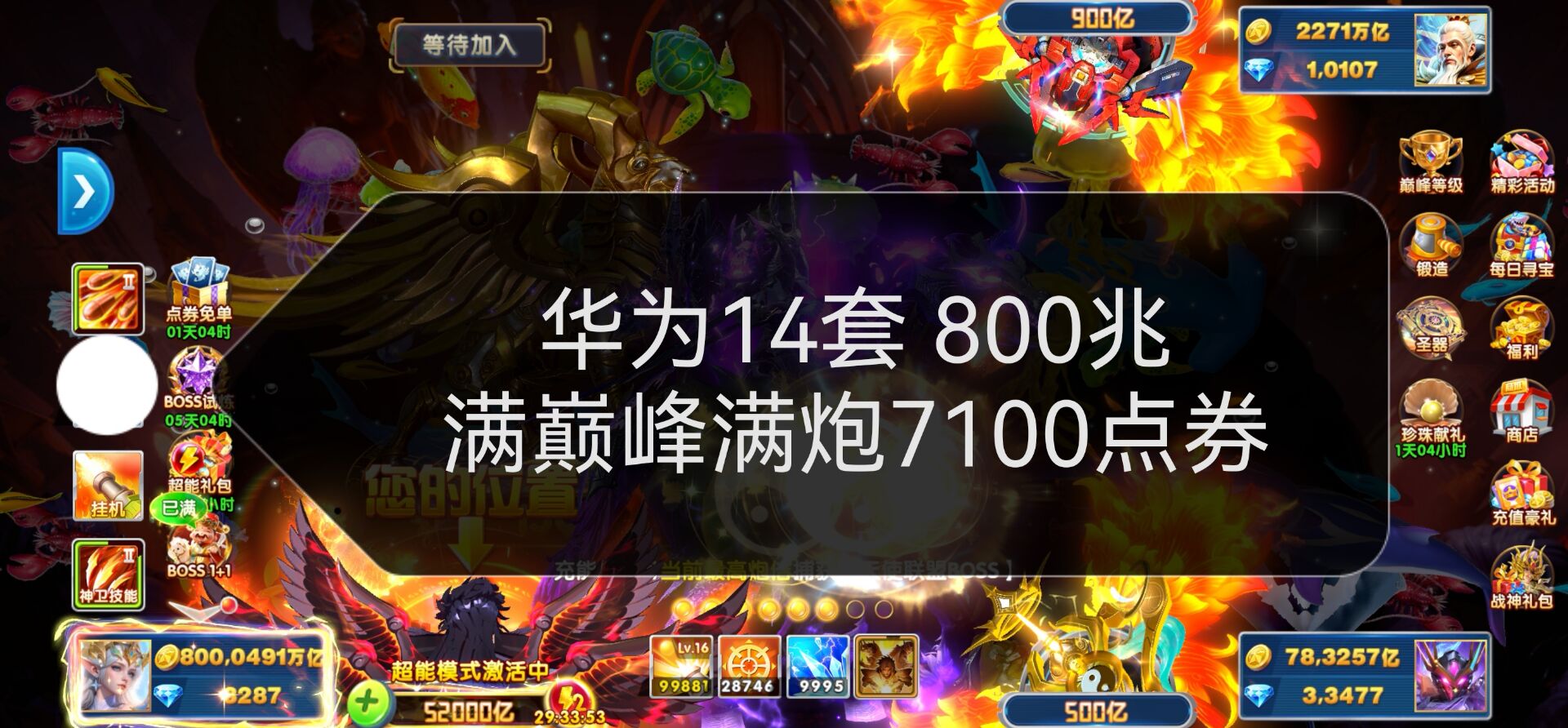 捕鱼大作战小米版本,原60亿炮,金币5.8兆,巅峰11级,巨多boss未打!