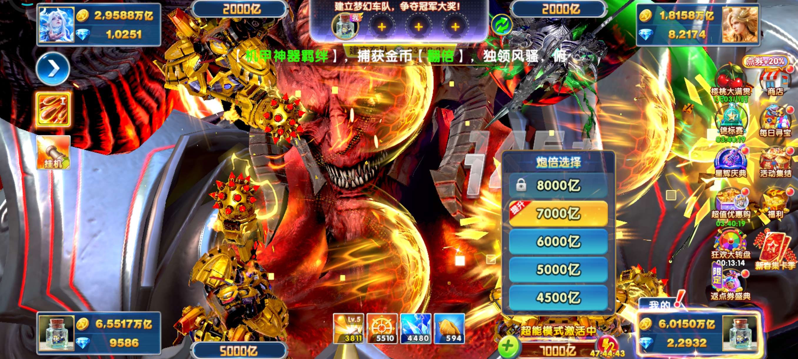 无绑V1 6000+1000炮 47500万亿 狂暴3300+ 巅峰15 临时战神 超能一天