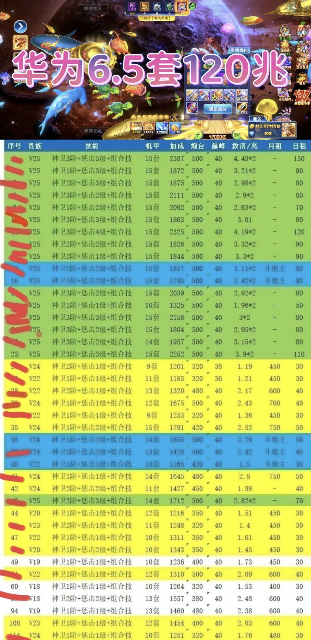 华为6.5套 特价出120兆金币 还有很多救济日租号,欢迎咨询选购。