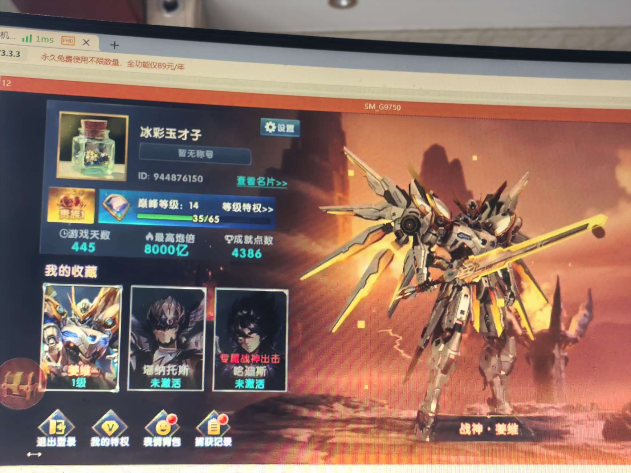 无绑v1,80+10炮7兆,巅峰14,进房间领超能和吕布,8字头可改一切