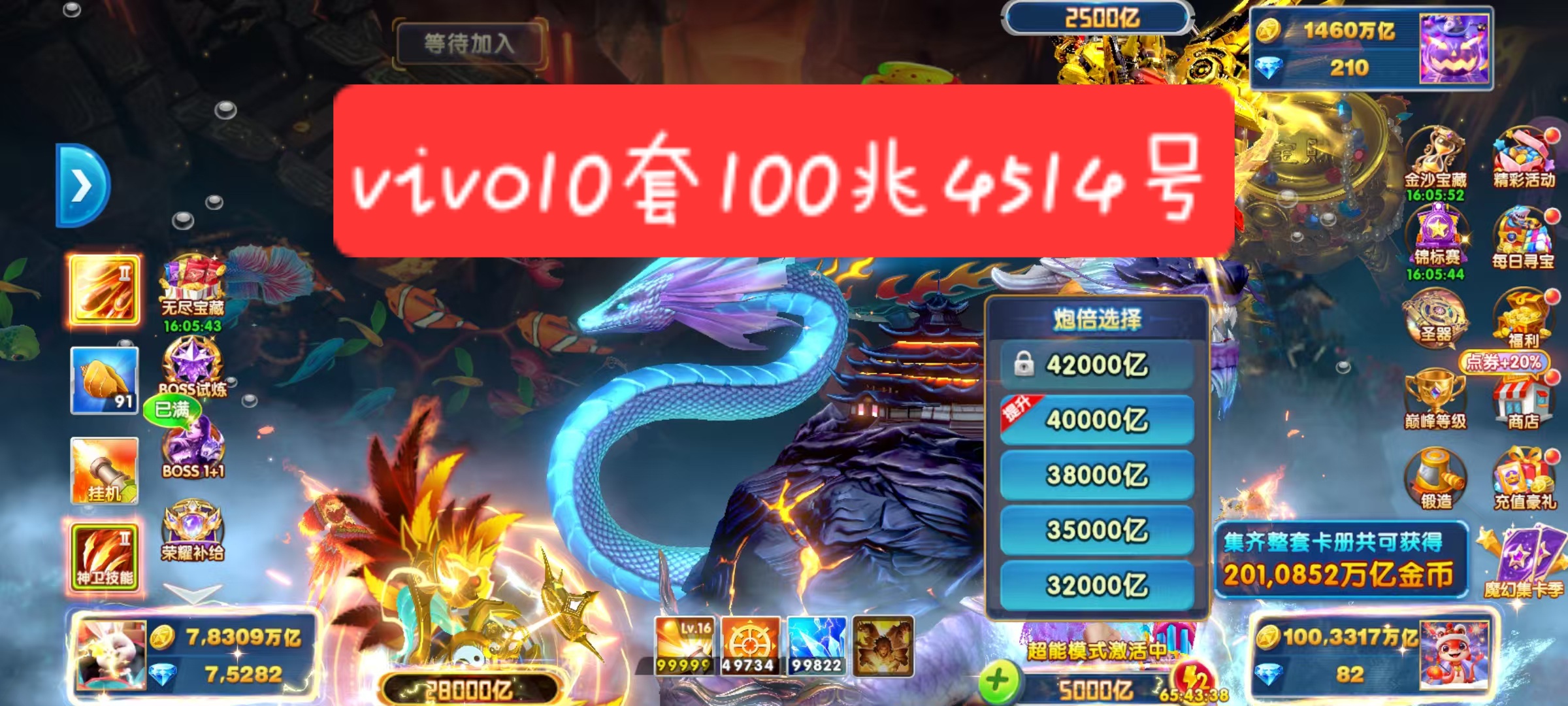 捕鱼大作战小米版本,原60亿炮,金币6.5兆,巅峰13级,破产回15,低价出售。