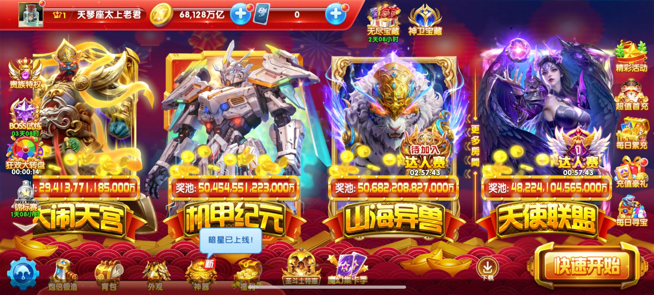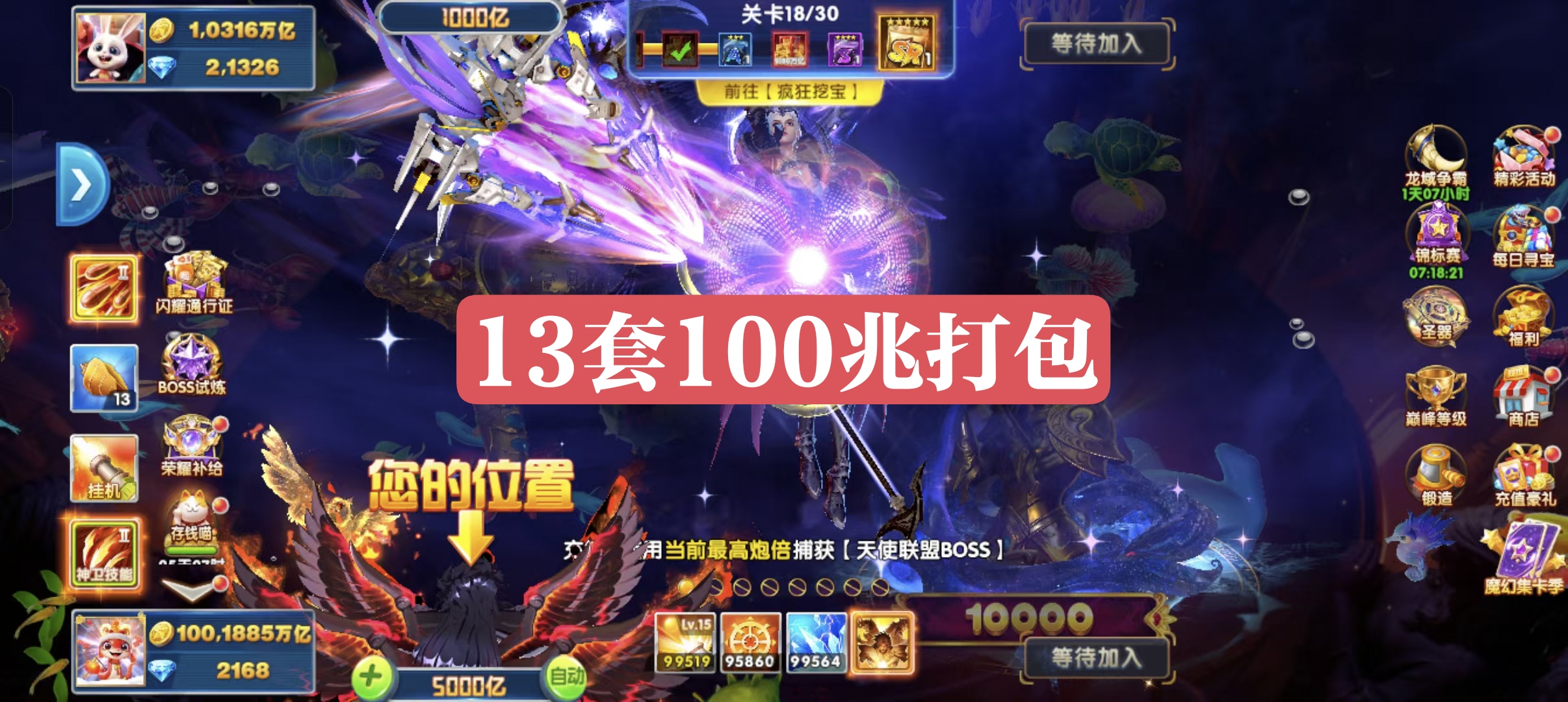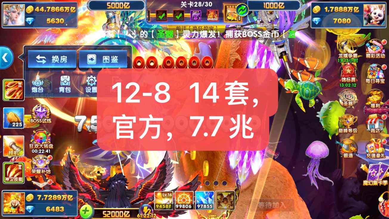 捕鱼大作战小米版本,原60亿炮,金币6.8兆,巅峰15级,5天加速,1天狂暴,巨多boss未打!,