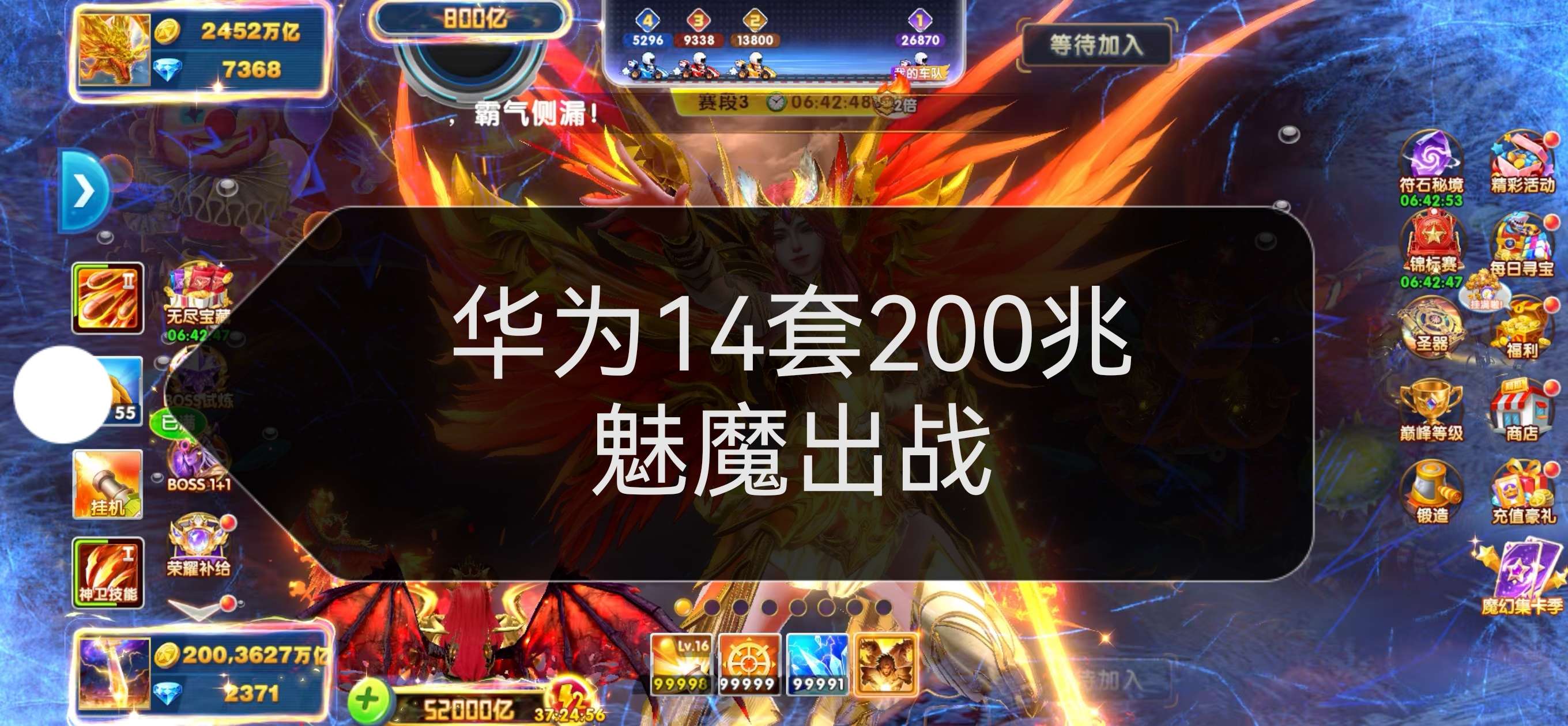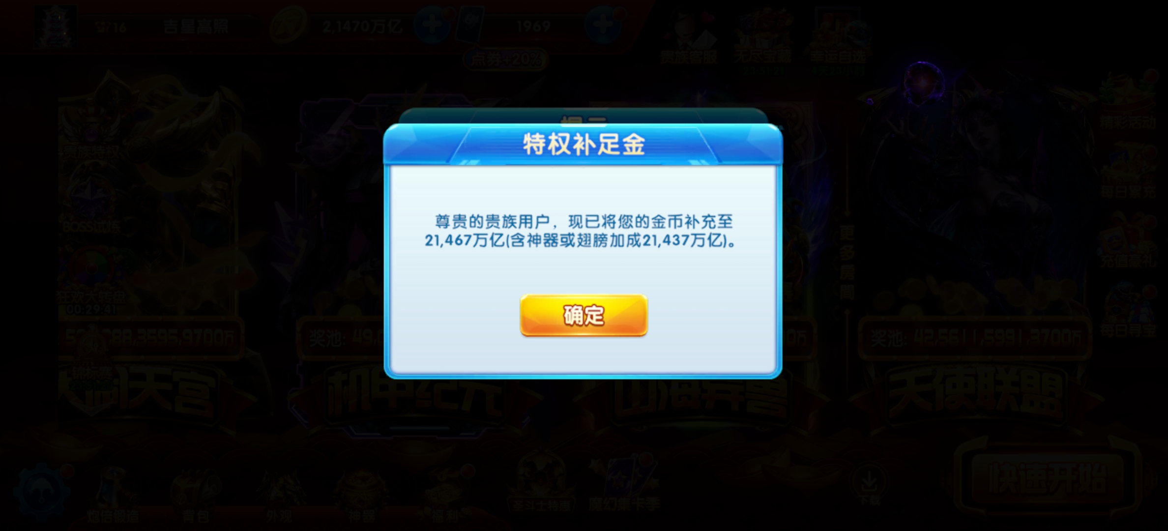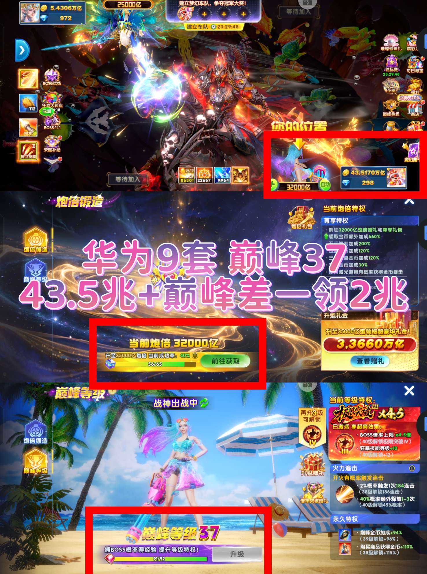 极品来了v19差4000v20纯救急2兆捕鱼大作战渠道号华为机甲14套老三国999新三国876西游999战神999圣器其他都是满的,天使544华为特权10高爆率炮台实际炮台42000加成1404巅峰满级技能齐全懂货的来