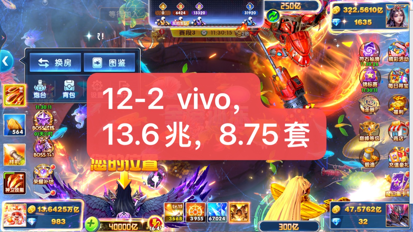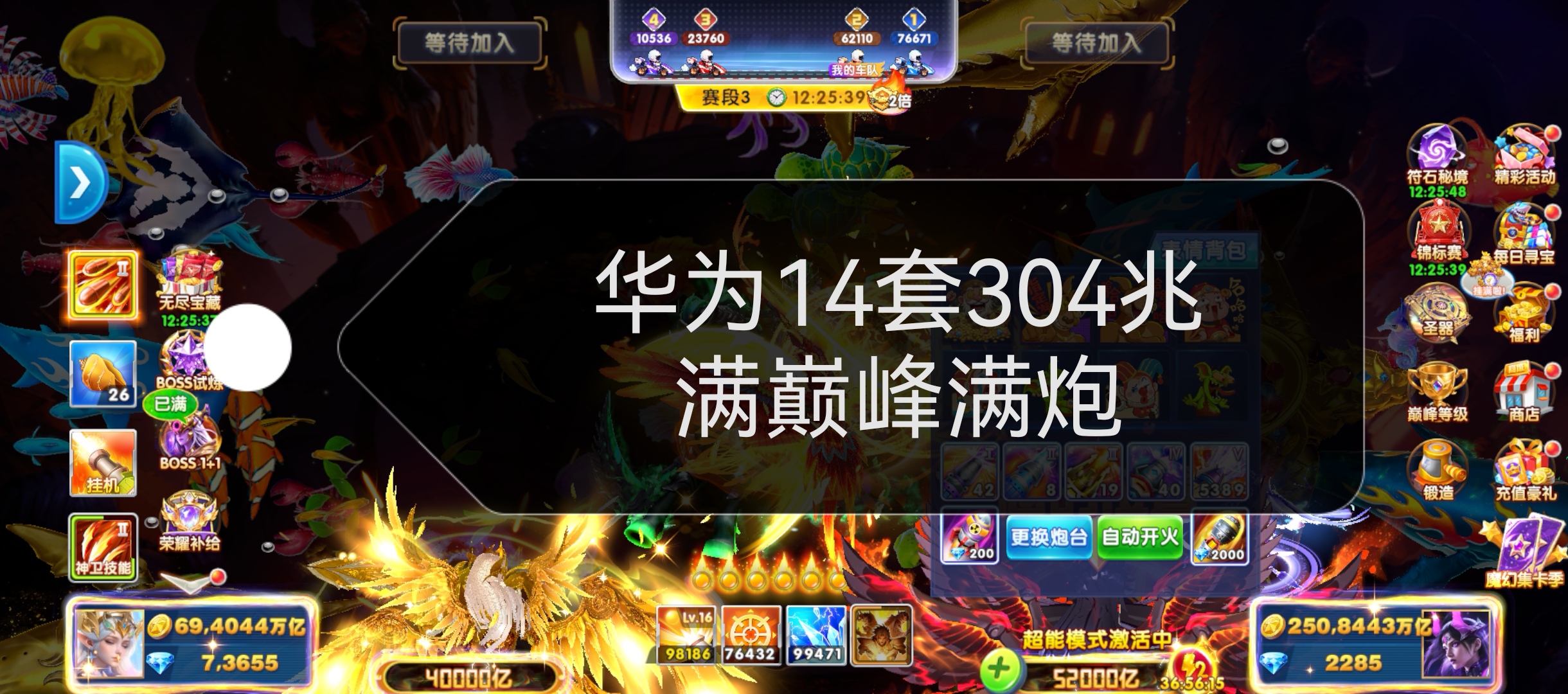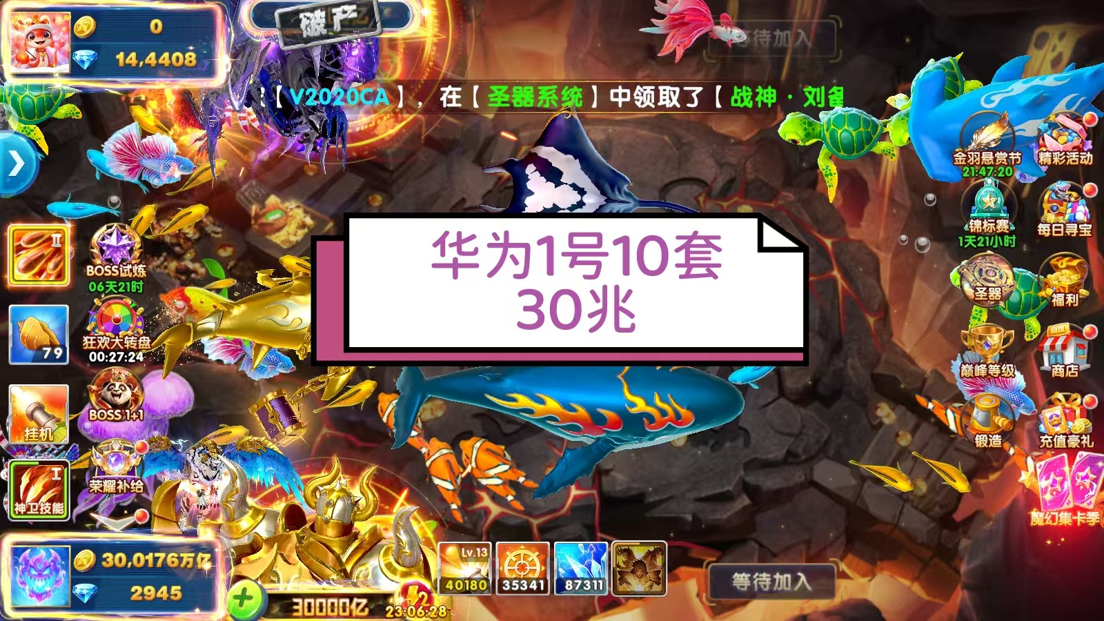 华为版本捕鱼大作战,特权12,贵族22,14级套,加成1798,5个冥斗士出战,好几个圣斗士快升级,随便搞搞2000加成,配置高,上线救急23409万亿,西游99,机甲999,三国999,新三国666