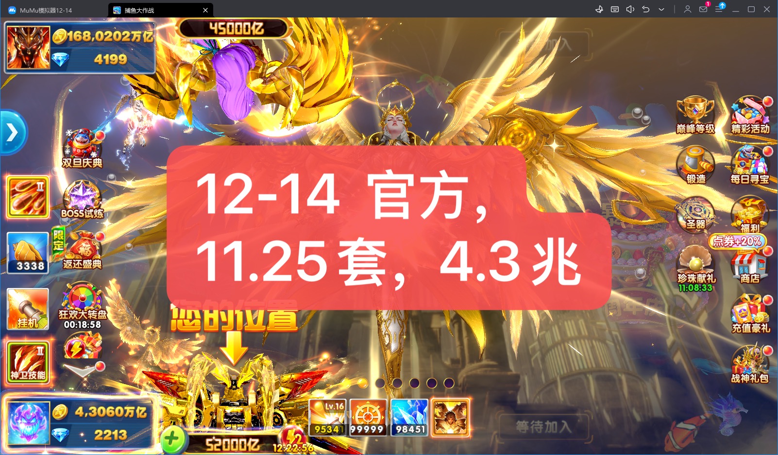 捕鱼大作战超低比例 424 万亿,炮台 100,巅峰 18,带号处,破产号回 90