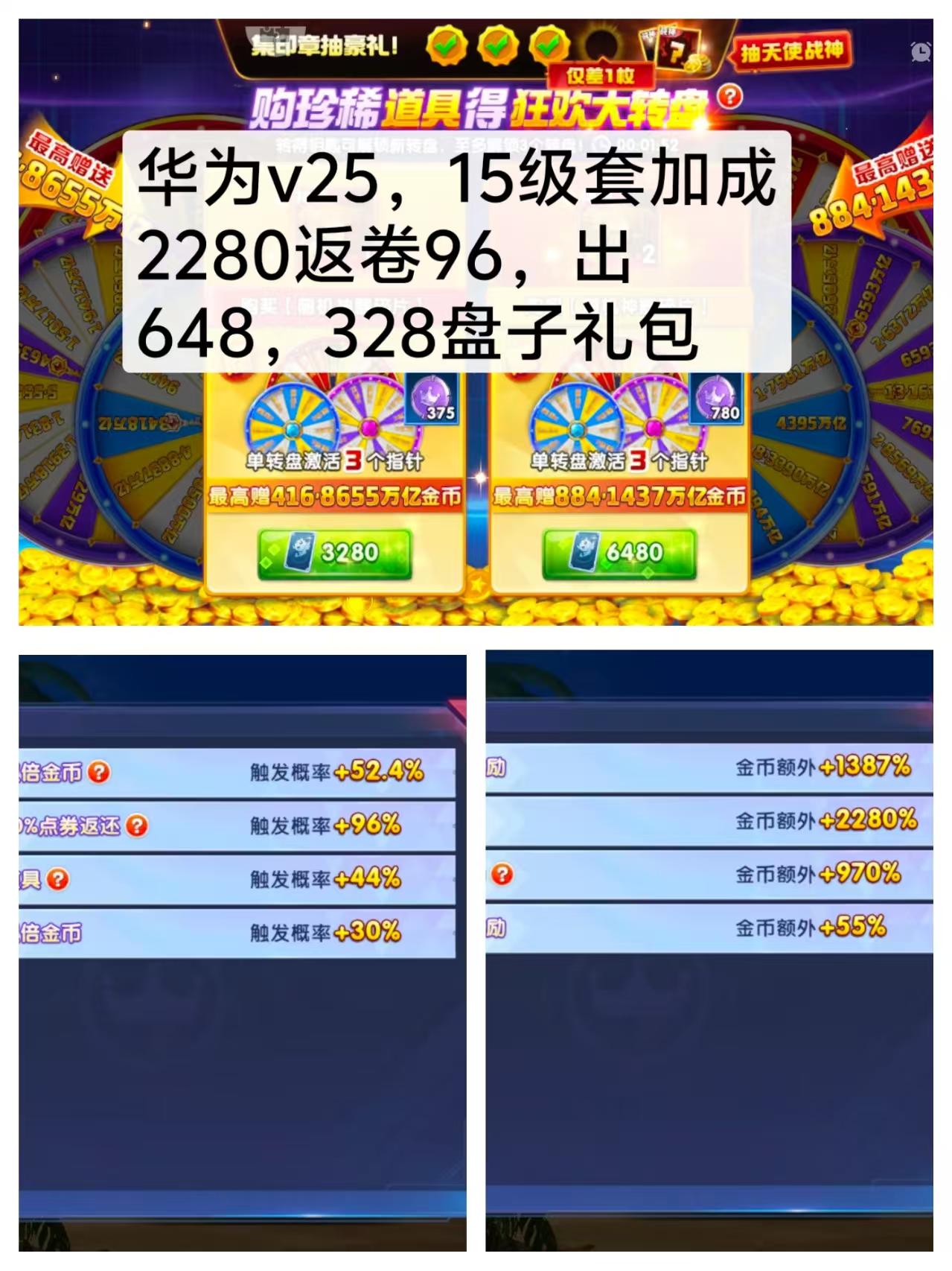 华为顶配15套V25加成2289/2280双反96/58出自转盘子,礼包分上分可回。