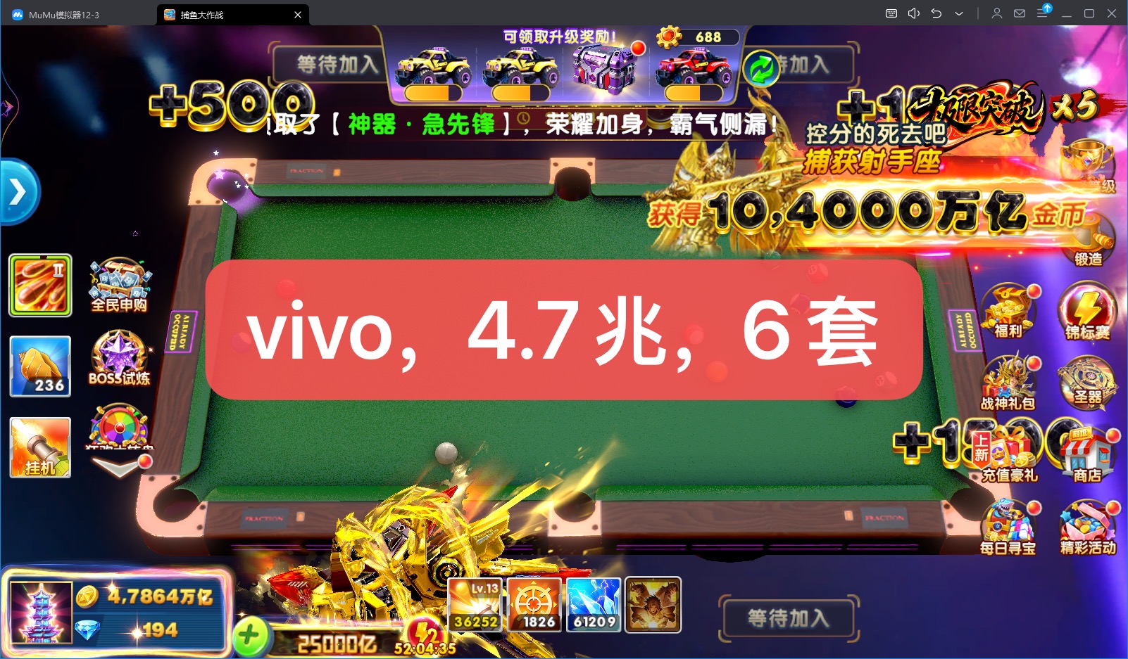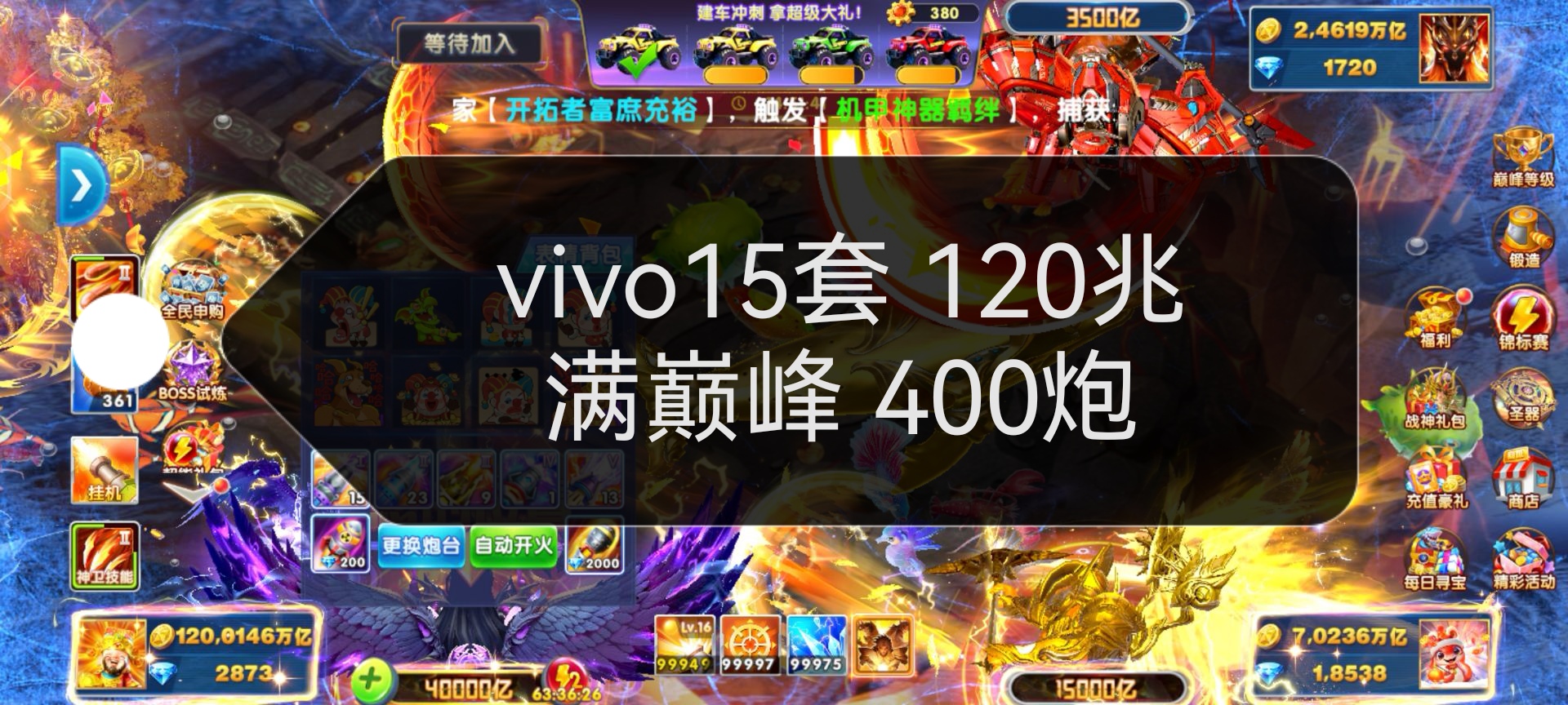 捕鱼大作战小米 v4 5700 万亿,炮台 160,巅峰 25,带号出,破产号 120 秒发货