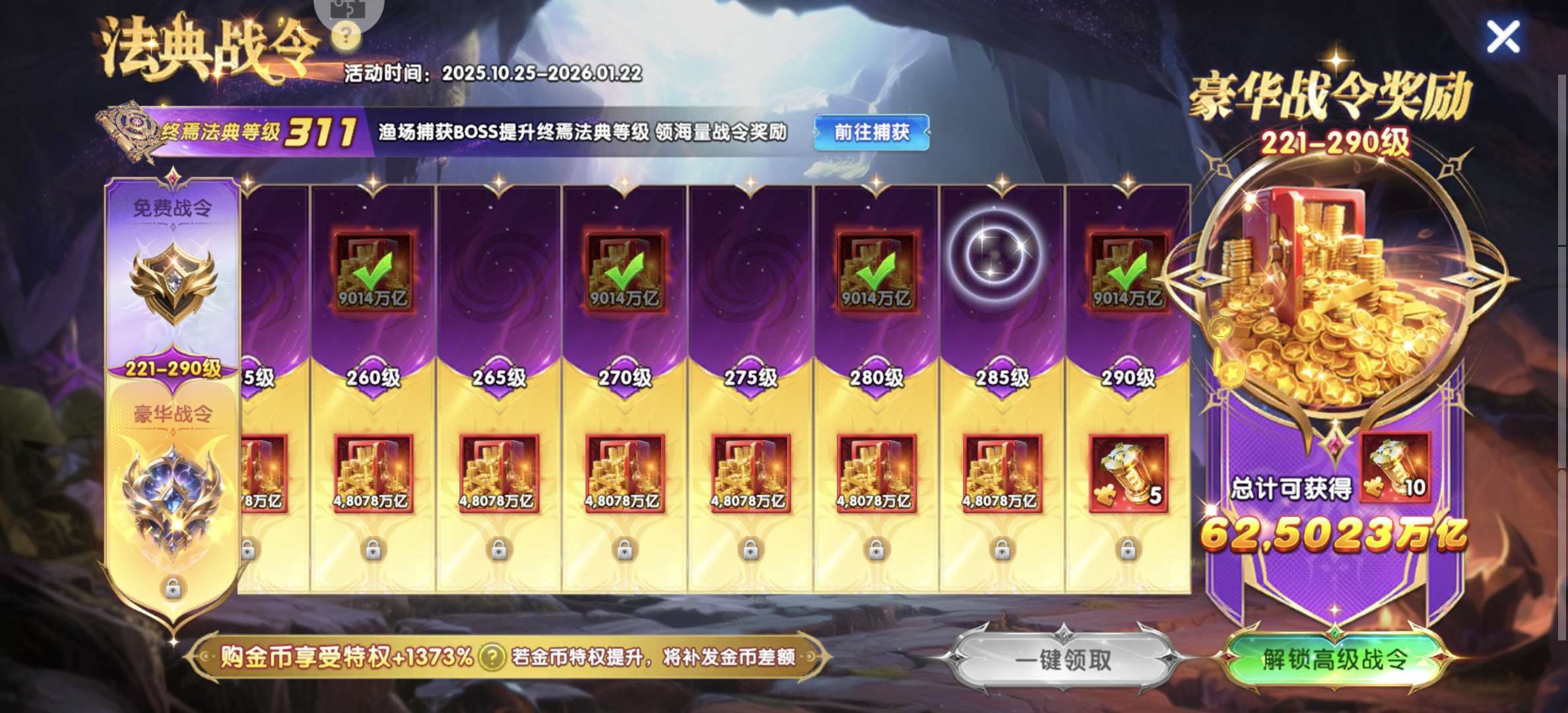 捕鱼大作战贵族号,特权高,金币加成多,通行证付费奖励+355%,购买金币+796%,日常活动+228