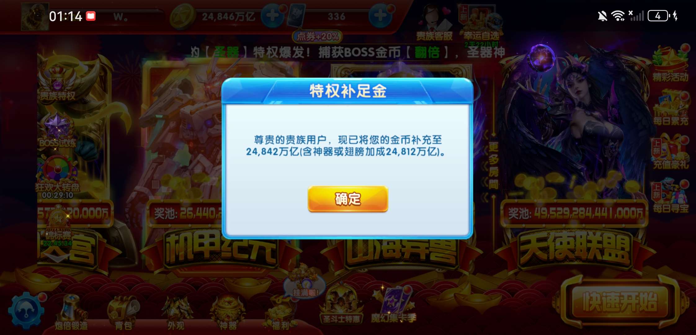 拥有最新战神切西亚,翅膀差五个全满,炮台基本满,西游神器满九,机甲神器满九,天使惩