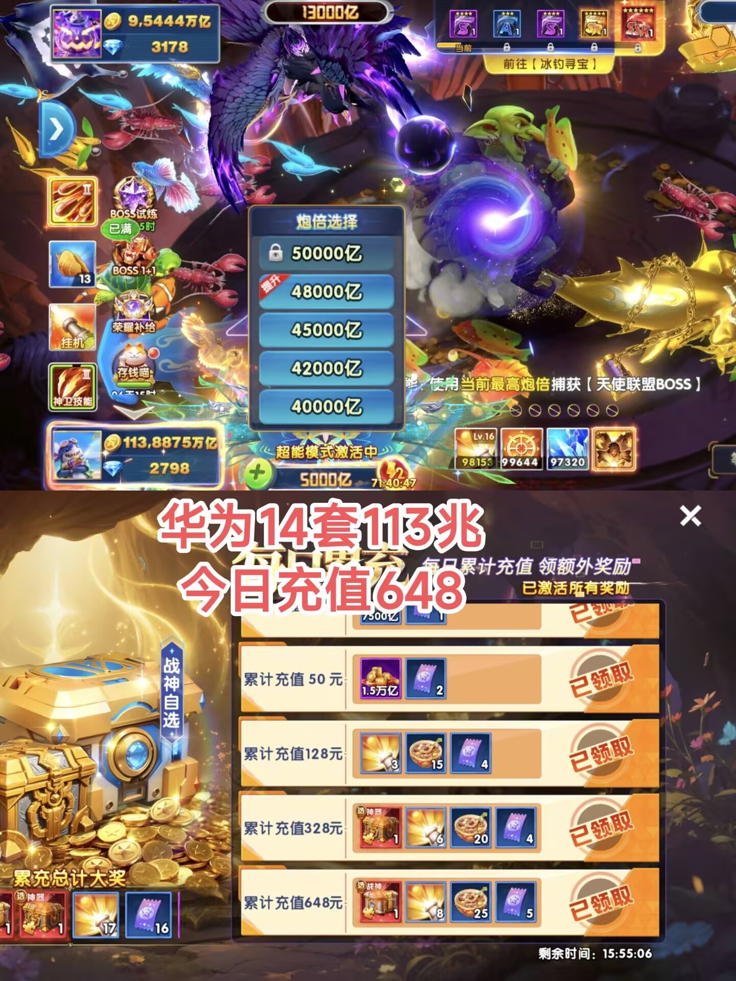 华为14套 出金币113兆,今日充值648,来正常打不拖号的。
