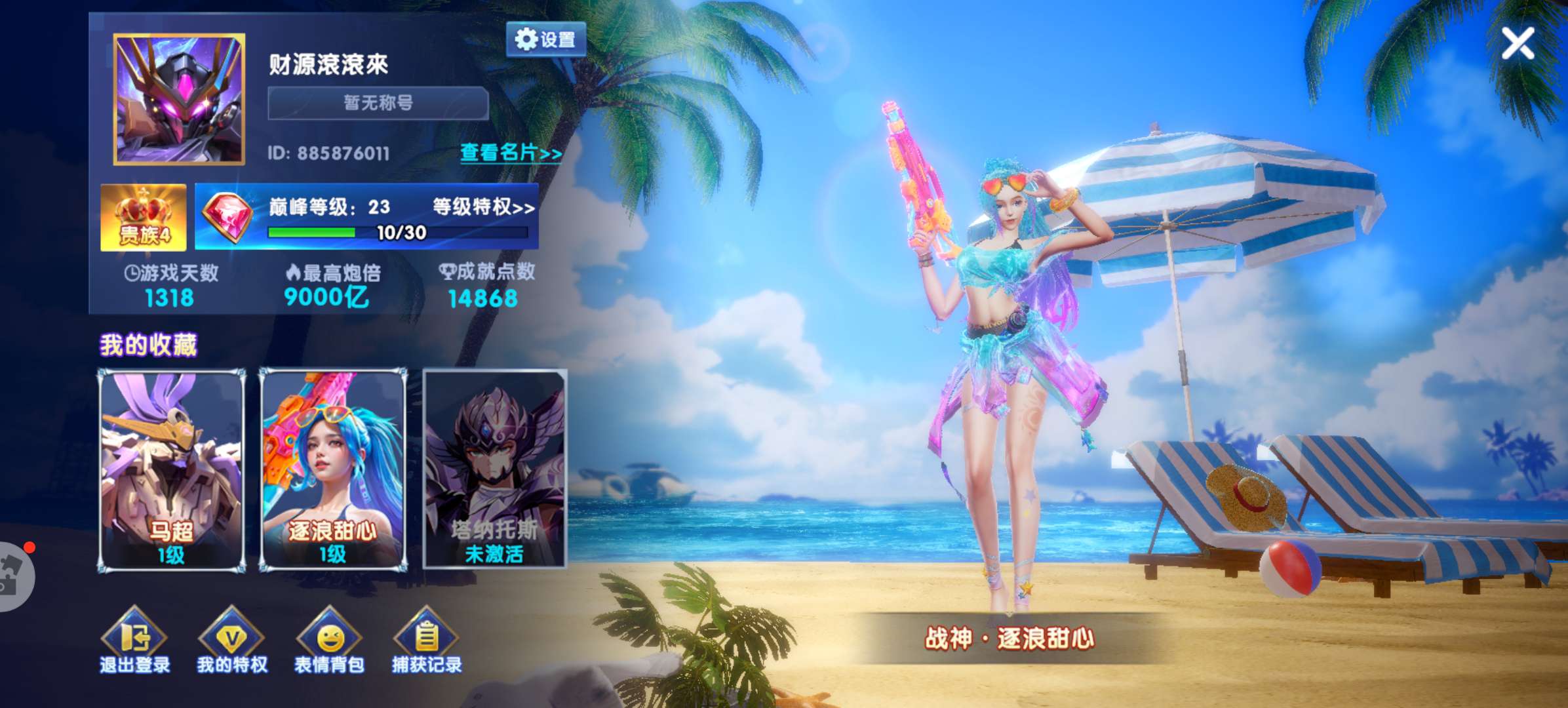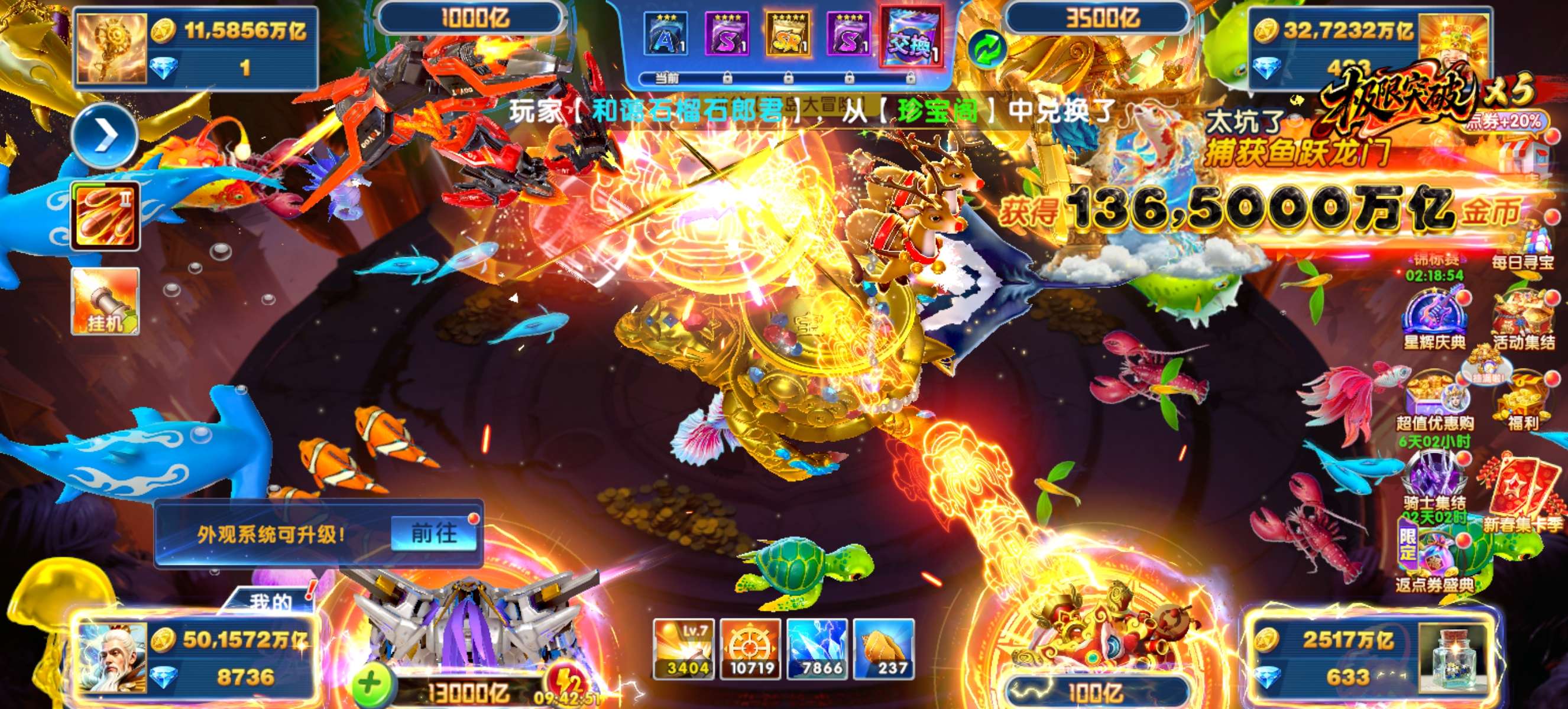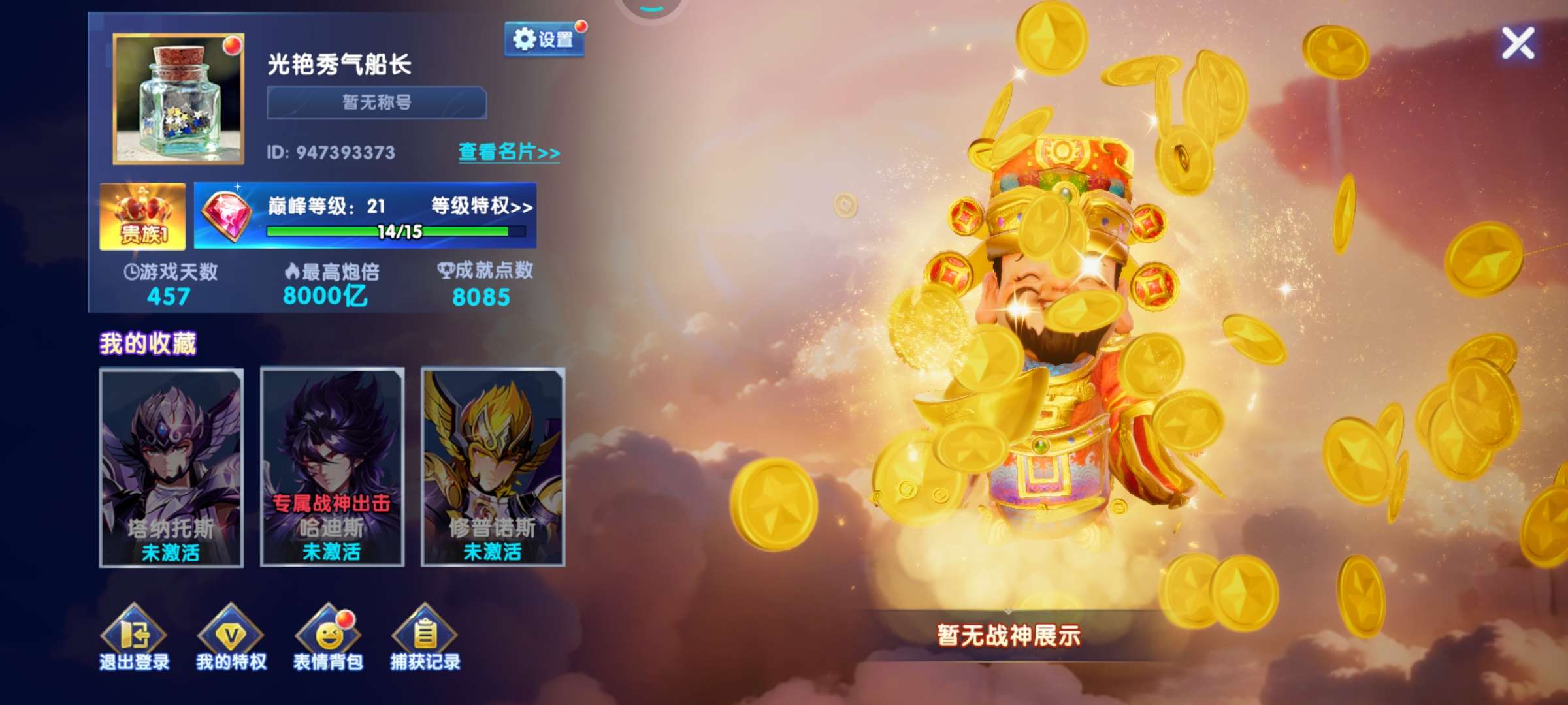 出售捕鱼大作战,华为版本,V15,480炮,特权10,救济1.83兆,加成1254,12套,西游99,机甲999,战神977,三国443,组合技,双神位,天使444,圣器全满级,最高上过2100兆