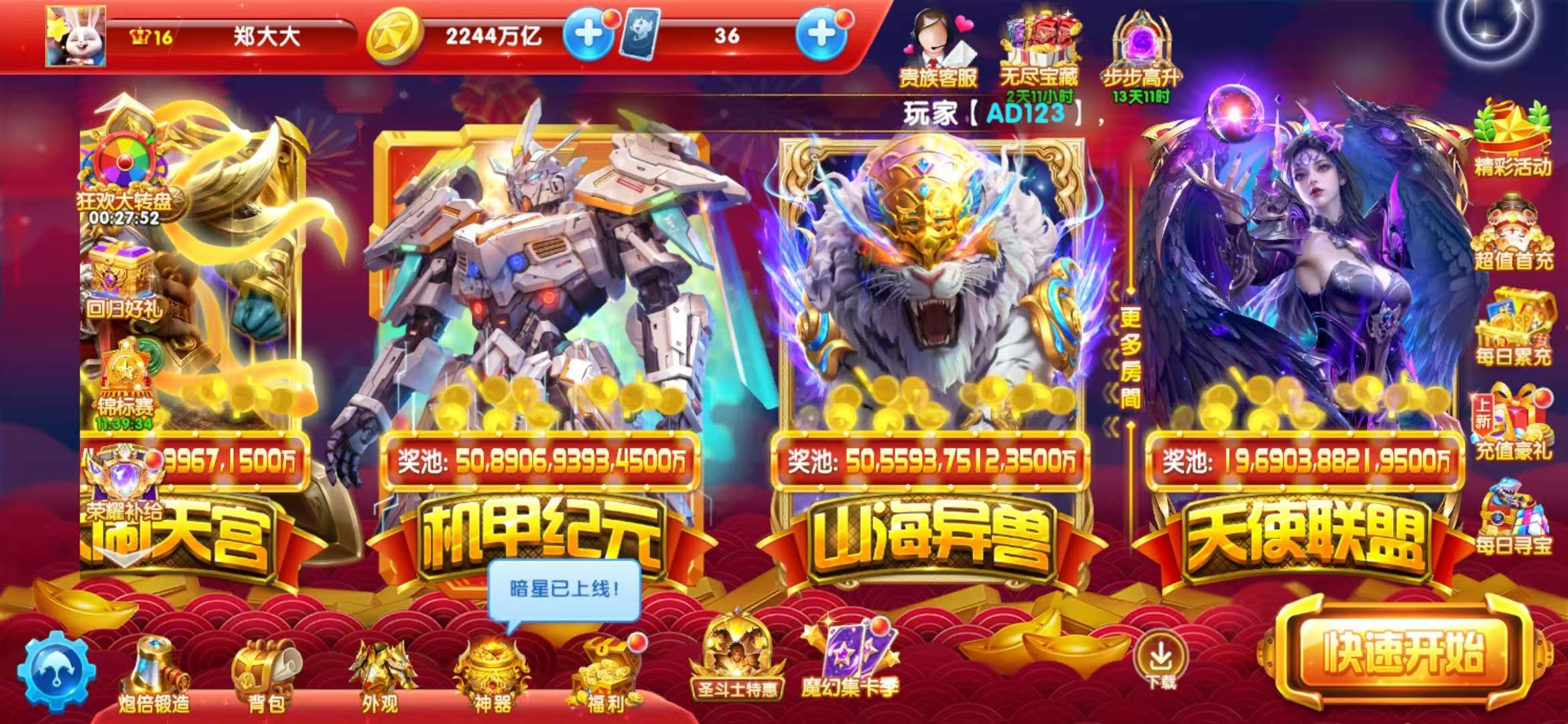 安卓oppo-贵族24,加成1595% 14套,双神卫觉醒,天使惩击,救济金1.99京翻倍就是4京
