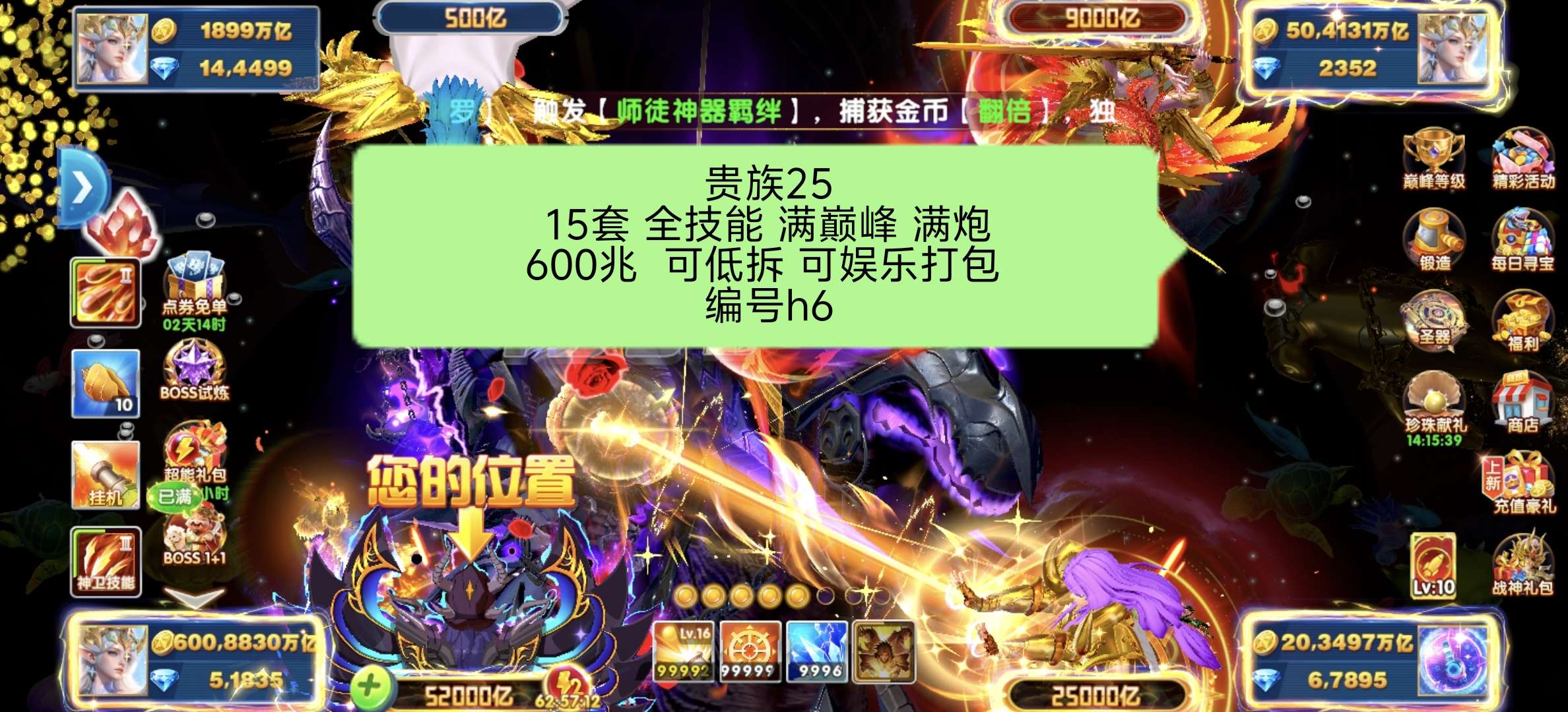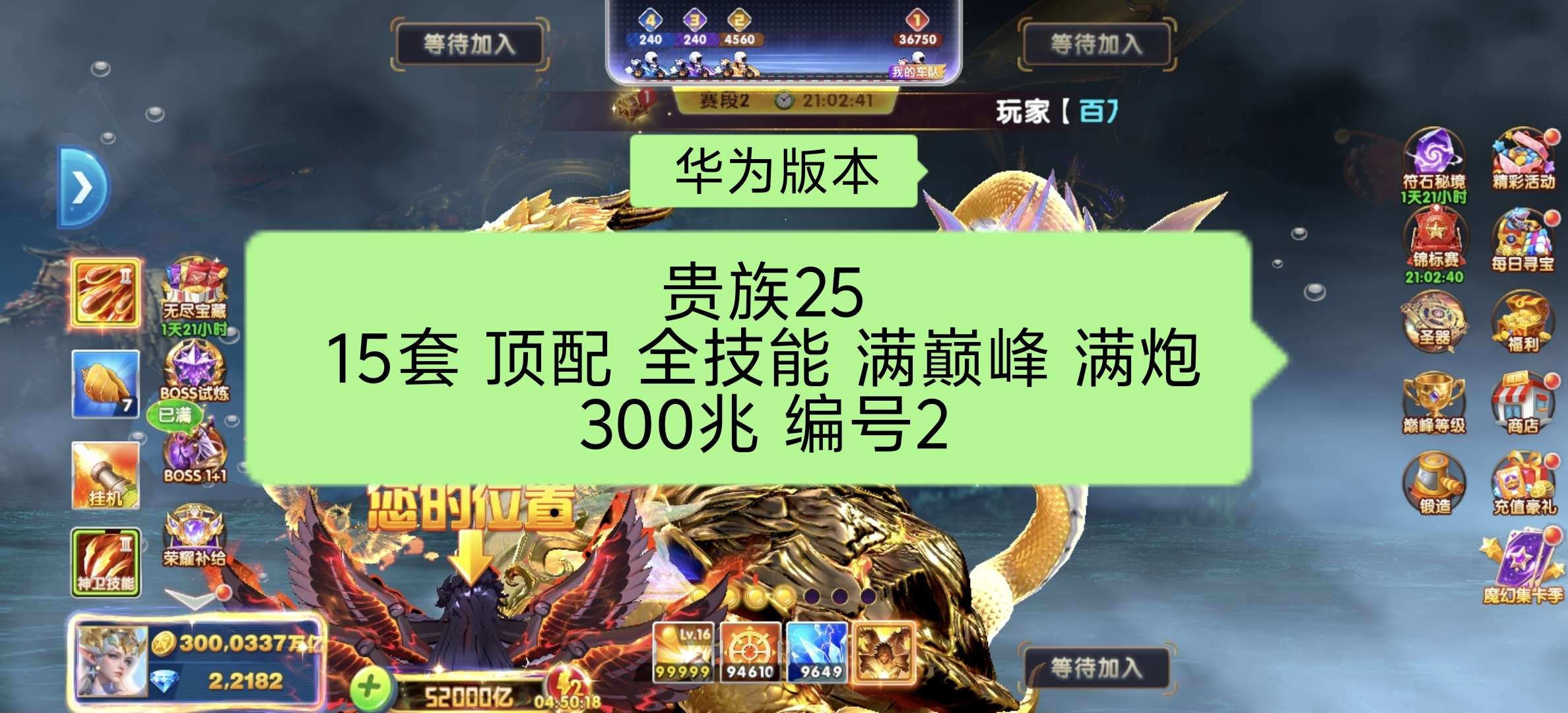 华为版本 贵族25顶配 600兆出租 战神超多。爆率超高