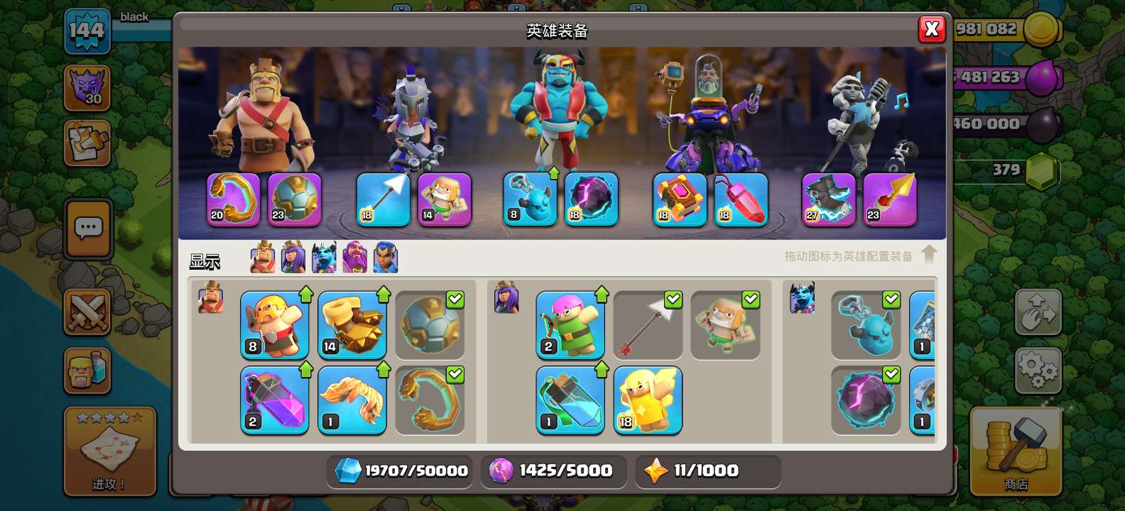 部落冲突【安卓QQ】17本满防,多件满级装备,多个氪金英雄皮肤