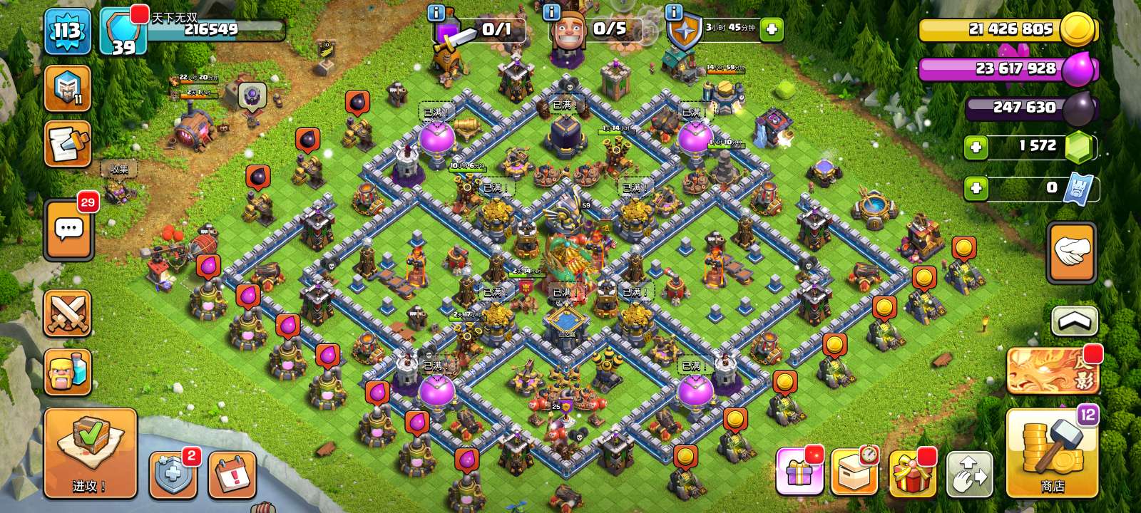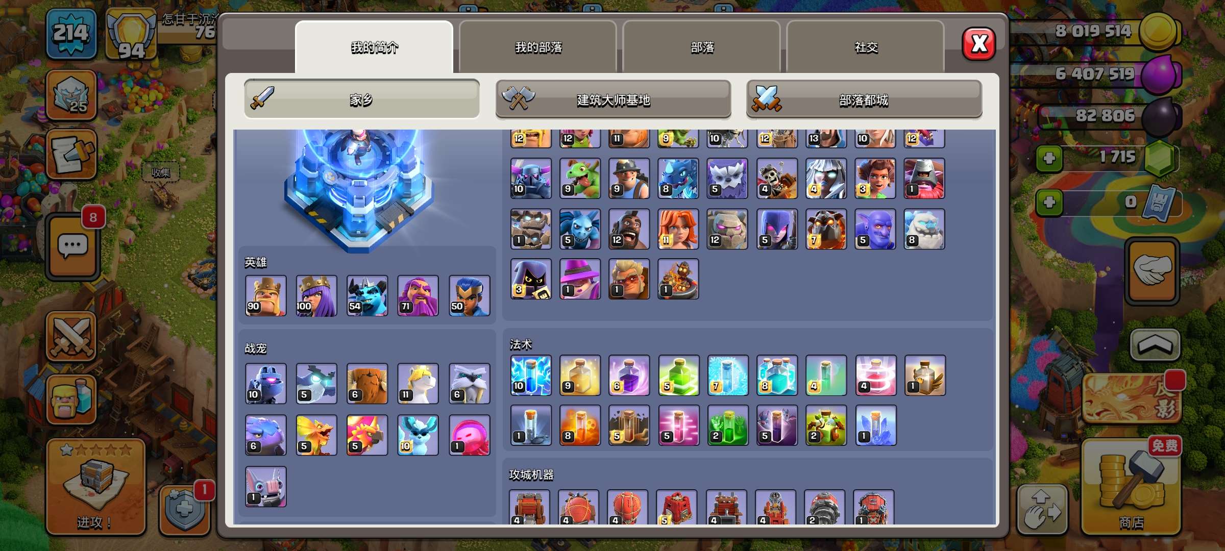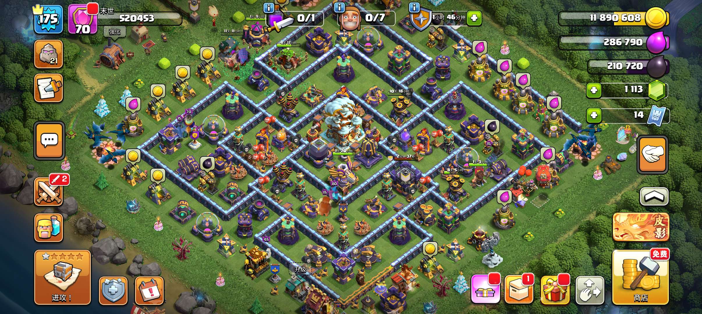 287级,夜世界38级科技防御城墙俩英雄全满毕业!主世界111繁荣,装备很好,5王等级高9700宝石