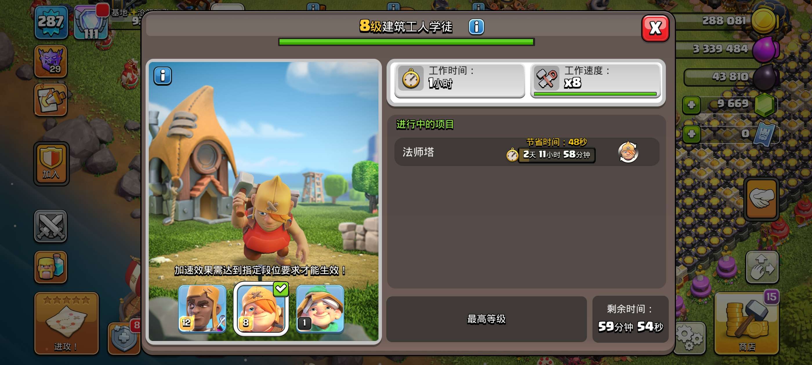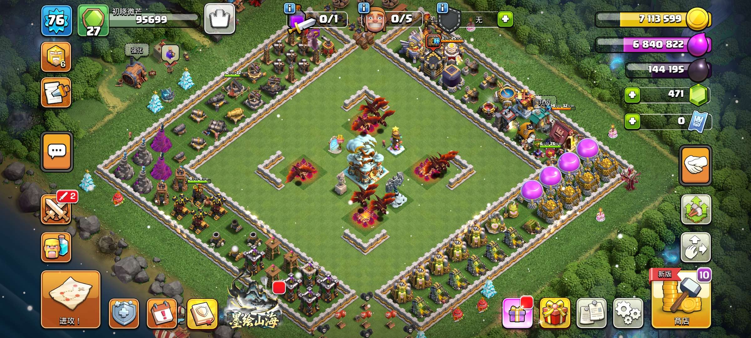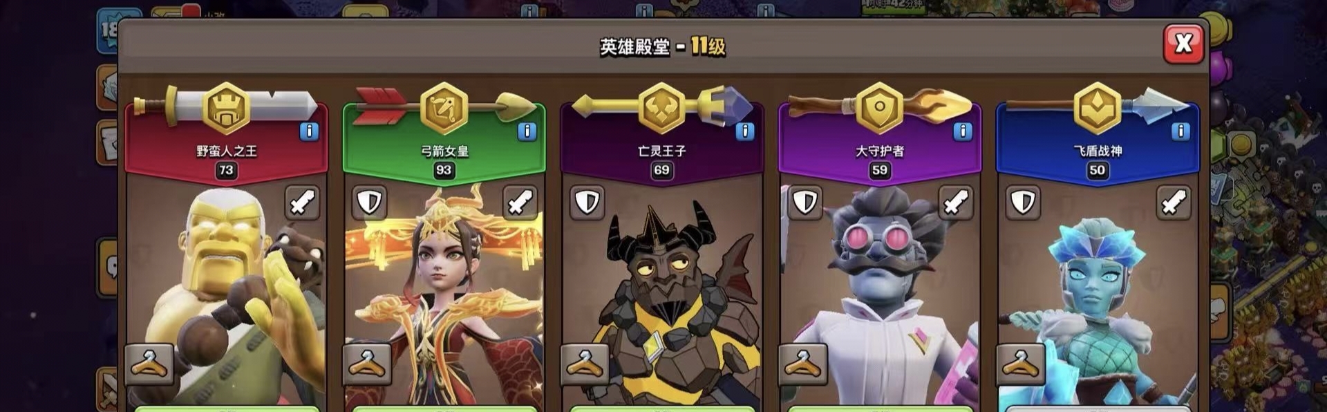 287级,夜世界38级科技防御城墙俩英雄全满毕业!主世界111繁荣,装备很好,5王等级高9700宝石