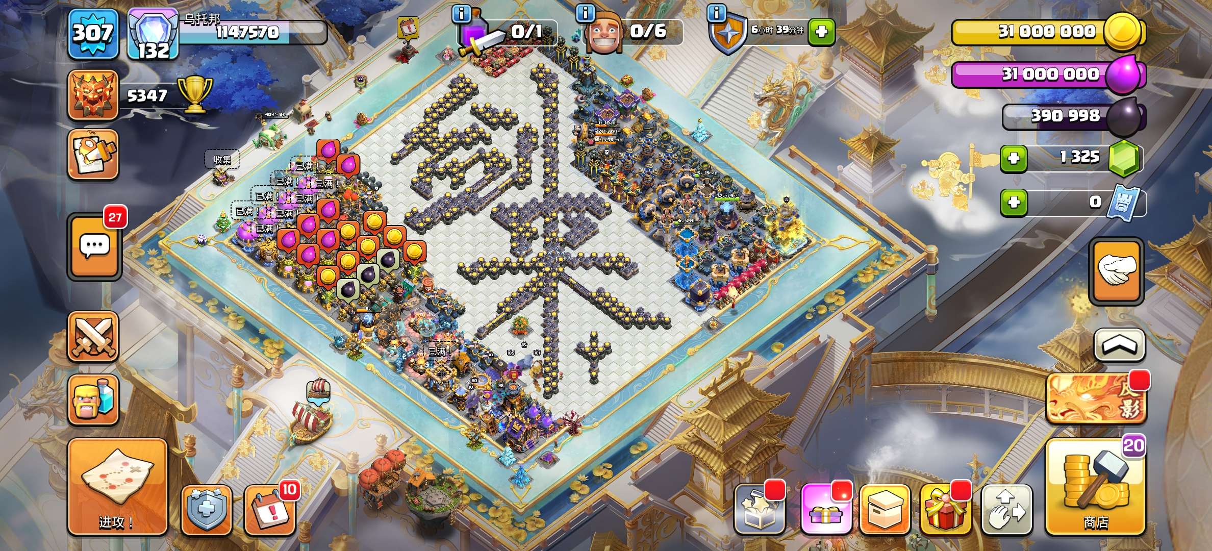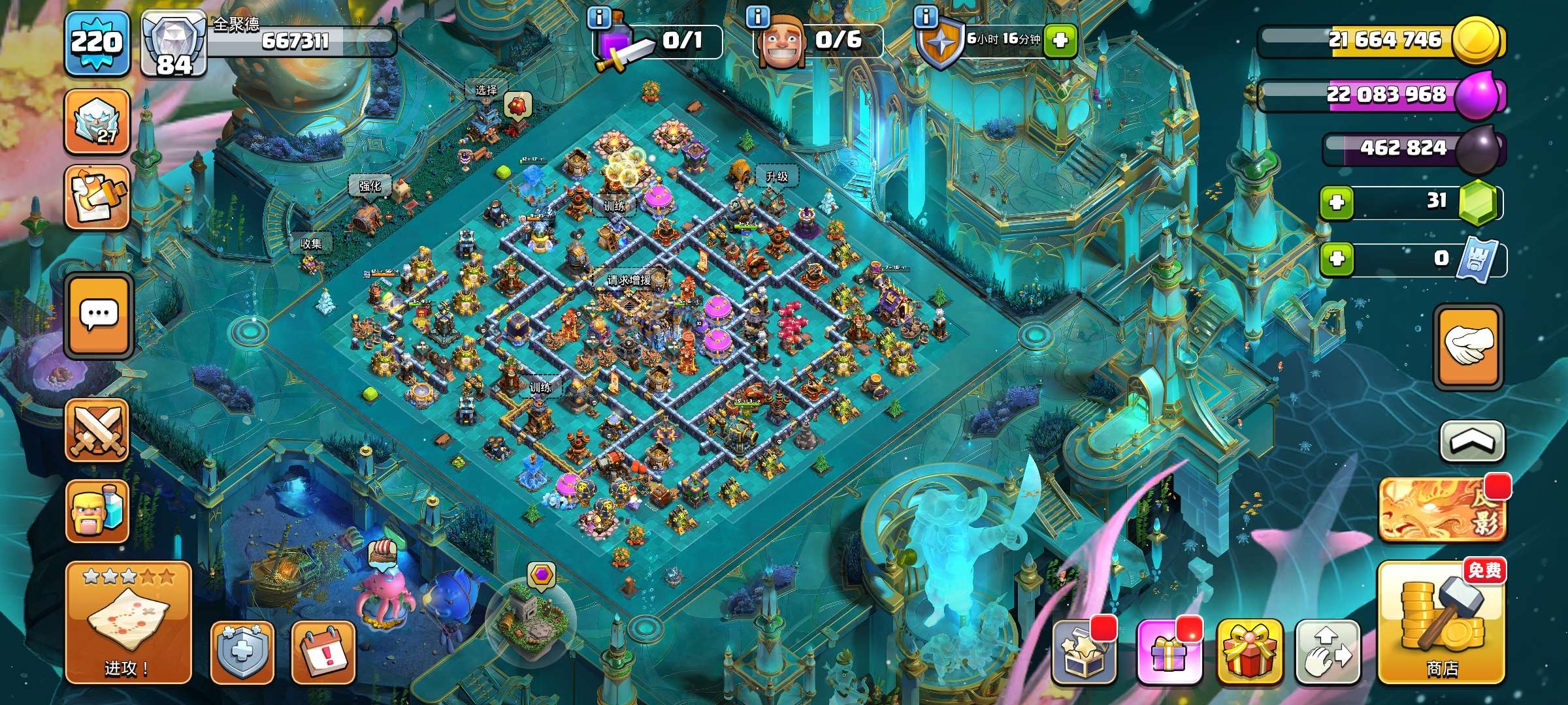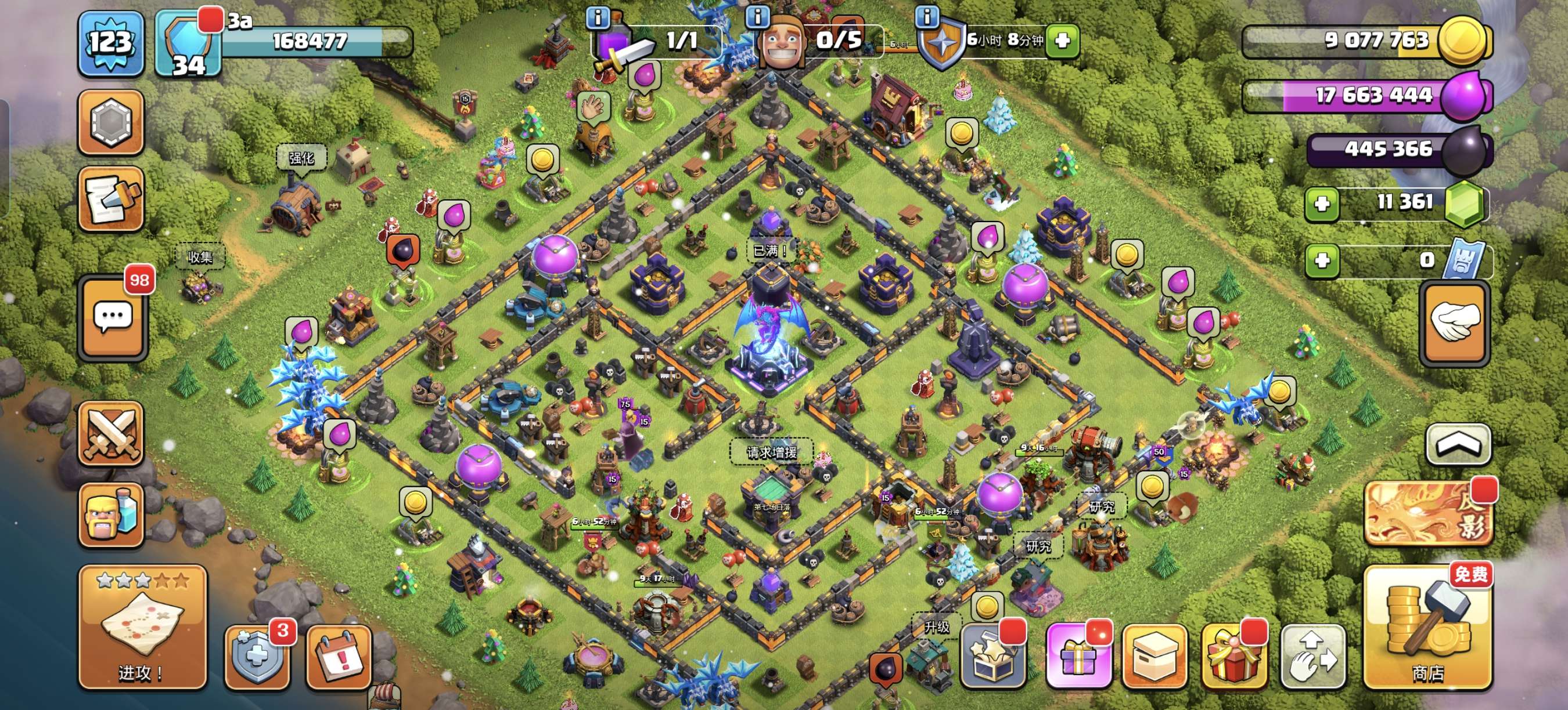 18本大后期,夜世界全满。天宫场景,防御基本全满,充能差一次全满,陷阱还未升