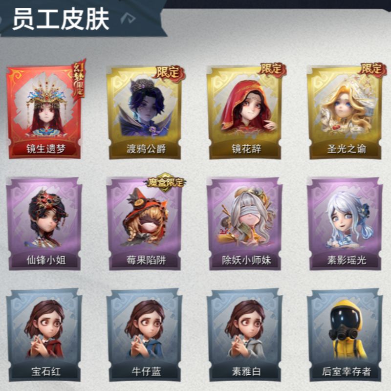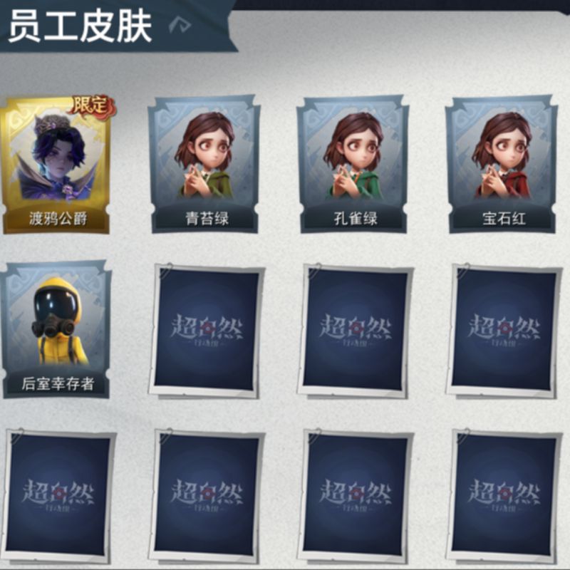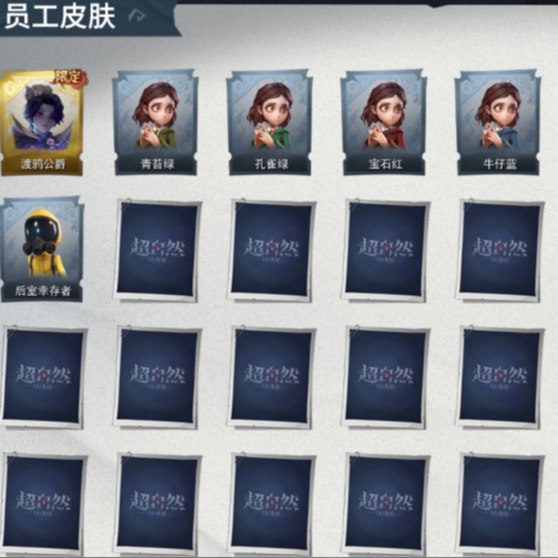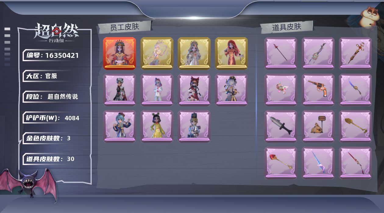 红皮:0,金皮:1,紫皮:0,道具皮:0,铲铲币:44w,累充:270金砖,服装:,员工:小黄、爱丽丝、零、薇薇安、艾伦,段位:实习生,赛季魔盒:普通魔盒,金色皮肤:零-渡鸦公爵,头饰:鱼头怪头套、烈焰红唇头套、面具马头套、哈士奇头套、萨卡班甲鱼头套、嘻嘻头套、滑稽头套、呆滞头套、卑微头套、
