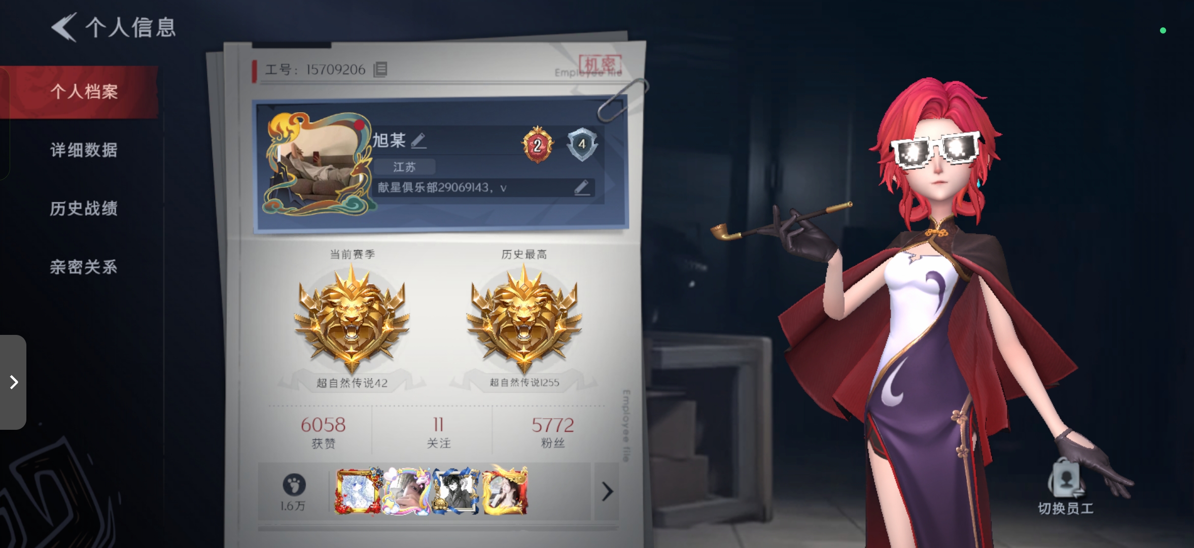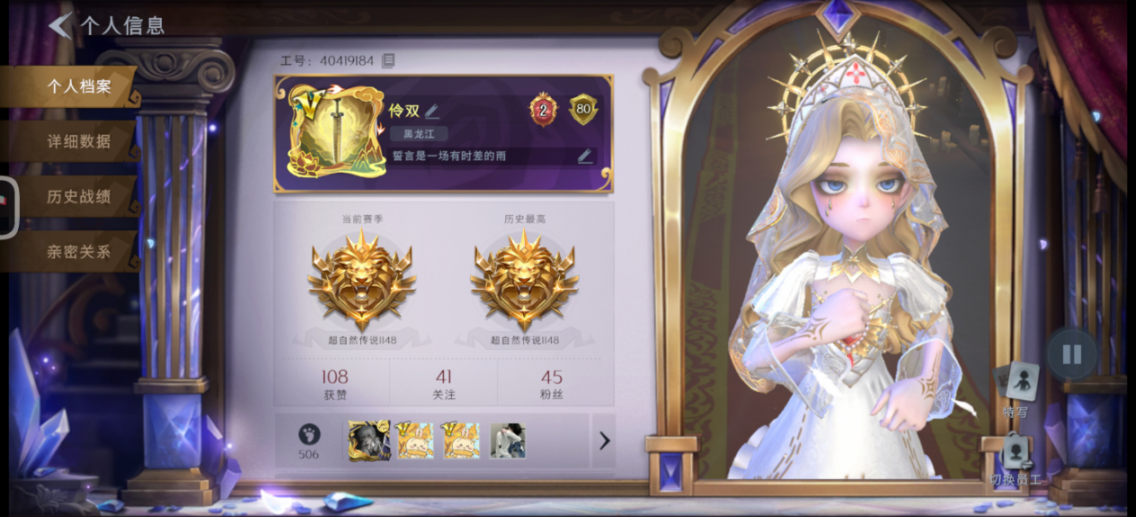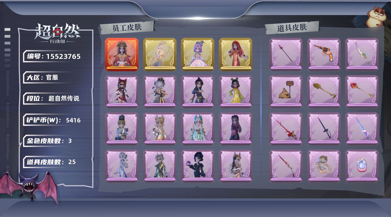 ZR184,超自然传说,红皮:1,金皮:3,紫皮:5,道具皮:19,铲铲币:2956w,累充:18680金砖,幻梦皮肤:巫铃儿-镜生遗梦,金色皮肤:薇薇安-圣光之谕