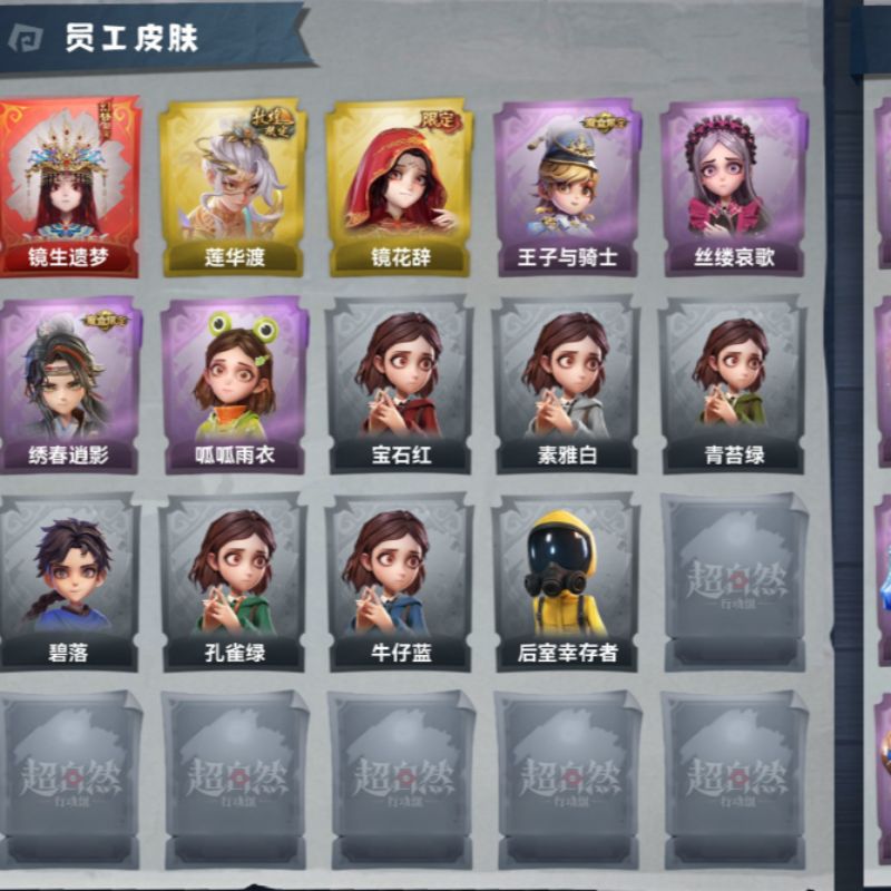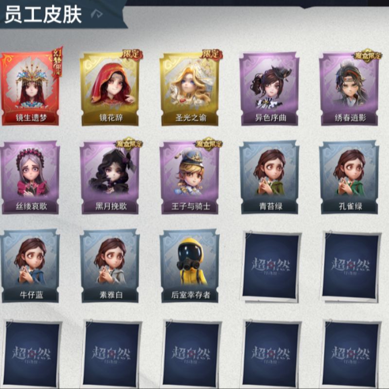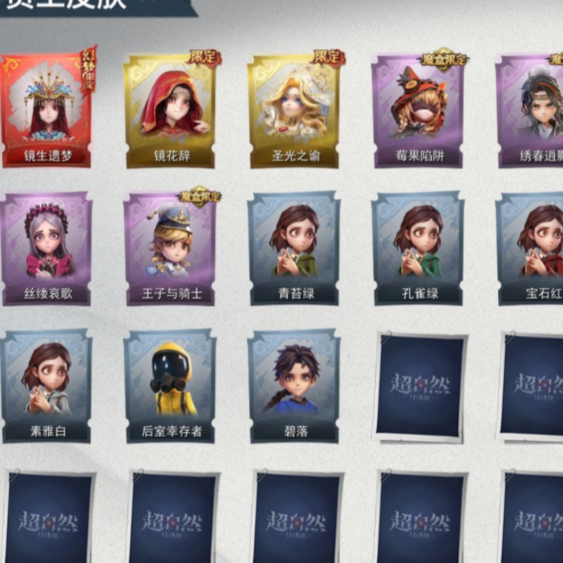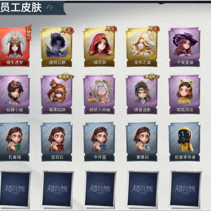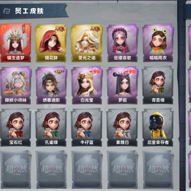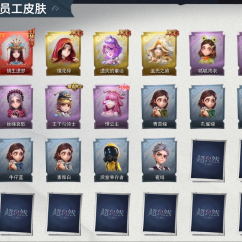 ZR181,红皮:1,金皮:4,紫皮:2,道具皮:22,铲铲币:54w,累充:28000金砖,幻梦皮肤:巫铃儿-镜生遗梦,金色皮肤:薇薇安-圣光之谕、爱丽丝-血色中的玛丽、小黄-遗失的童话、巫铃儿-镜花辞,紫色皮肤:零-赤炼将军、薇薇安-黑月挽歌,员工:小黄、爱丽丝、零、